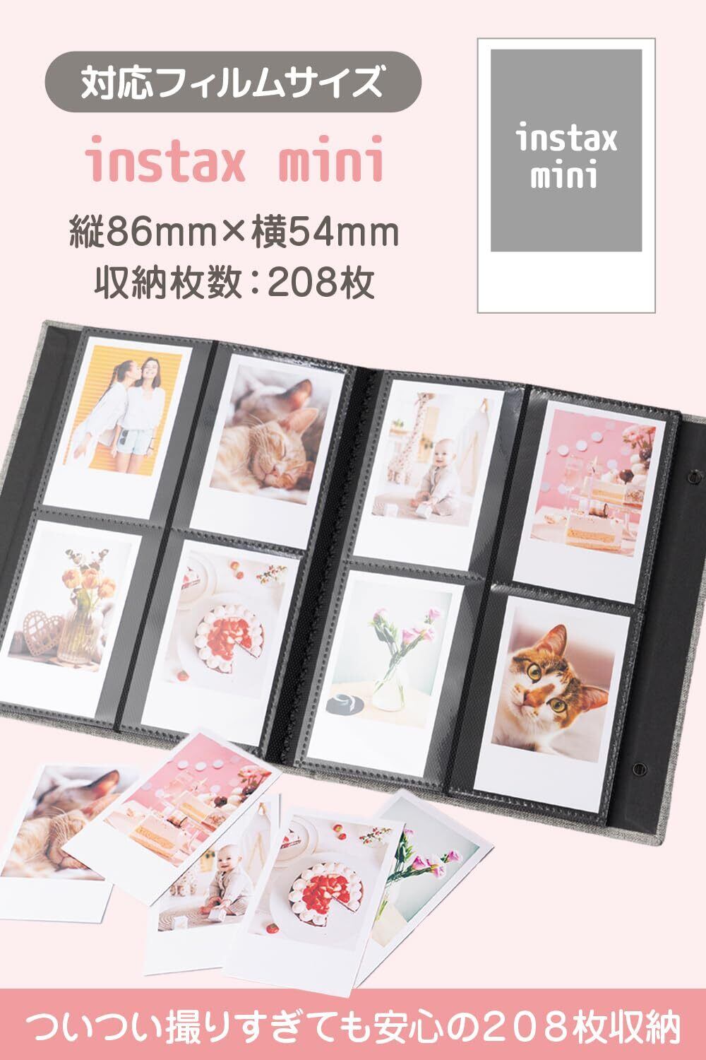 【 大容量 】 ついつい撮りすぎても安心の208枚も収納できる大容量アルバムですフィルムサイズ「mini」に対応しています。