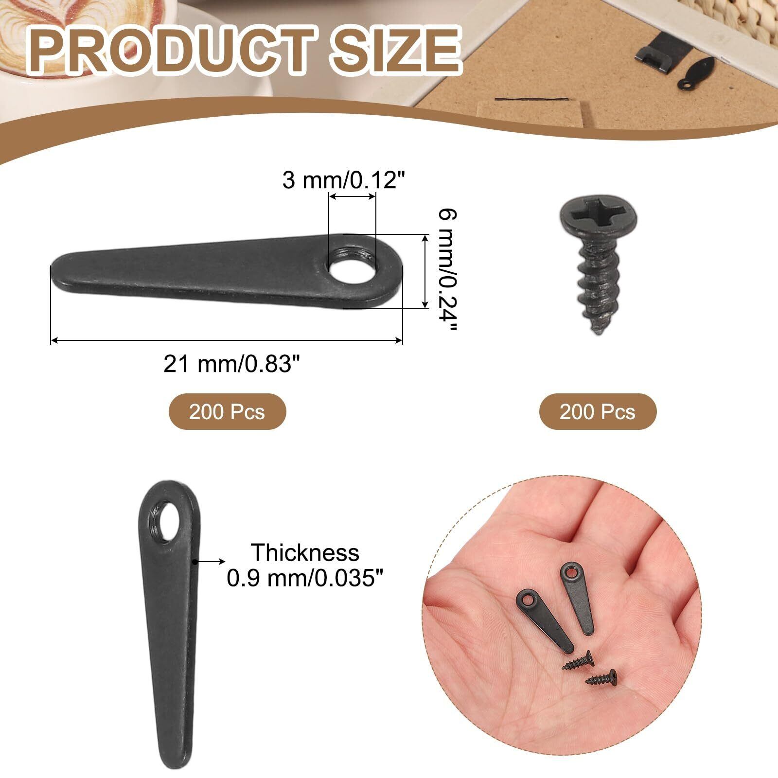 製品内容:ポインター形状の黒フォトフ レームボタン200個とネジ200本。フォトフ レームボタンのサイズは長さ21mm/0.83インチ、幅6mm/0.24インチ、取付穴径3 mm/0.12インチで、写真フ レームや窓枠に写真を固定するのに適しています。