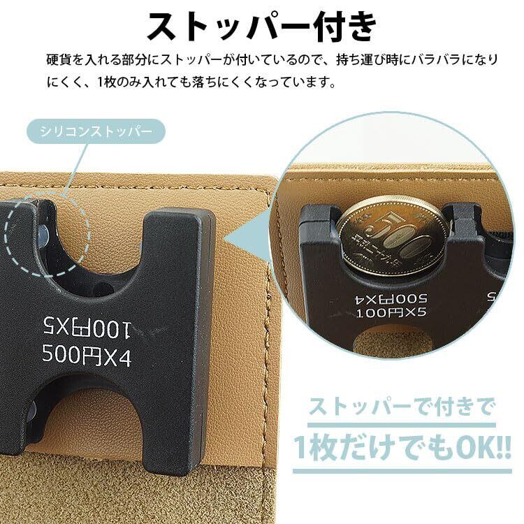 硬貨を入れる部分にストッパーが付いているので、持ち運び時にバラバラになりにくく、1枚のみ入れても落ちにくくなっています。