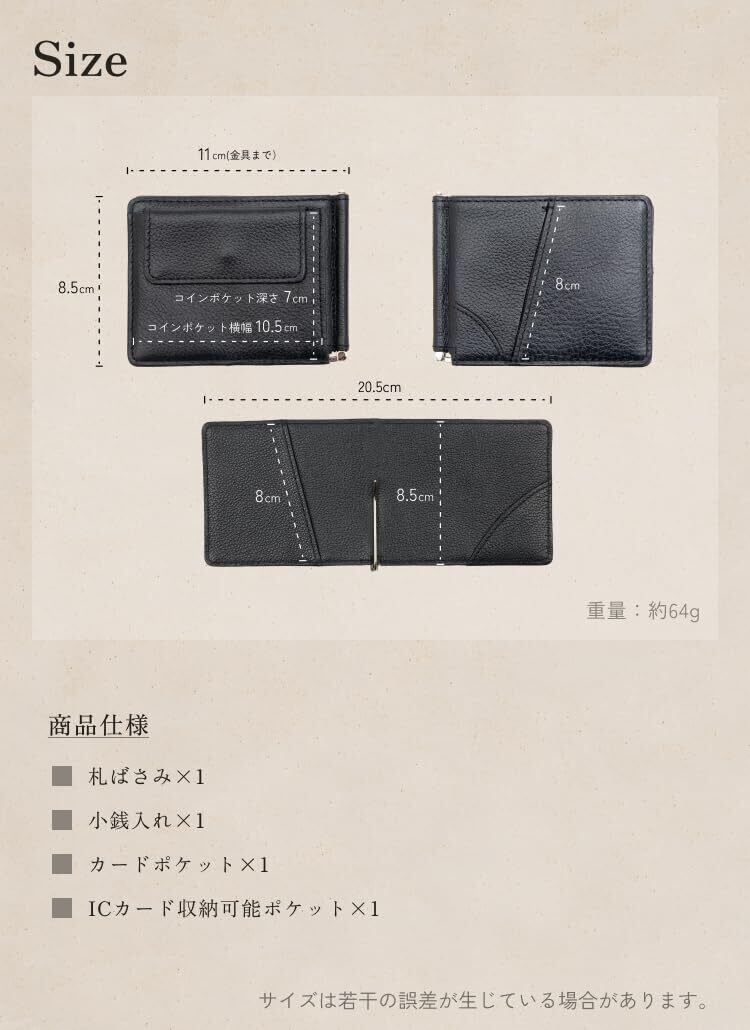 タイプ :マネークリップ 、 素材 :牛本革 、サイズ :高さ8.5㎝×幅11cm×厚み0.8cm
