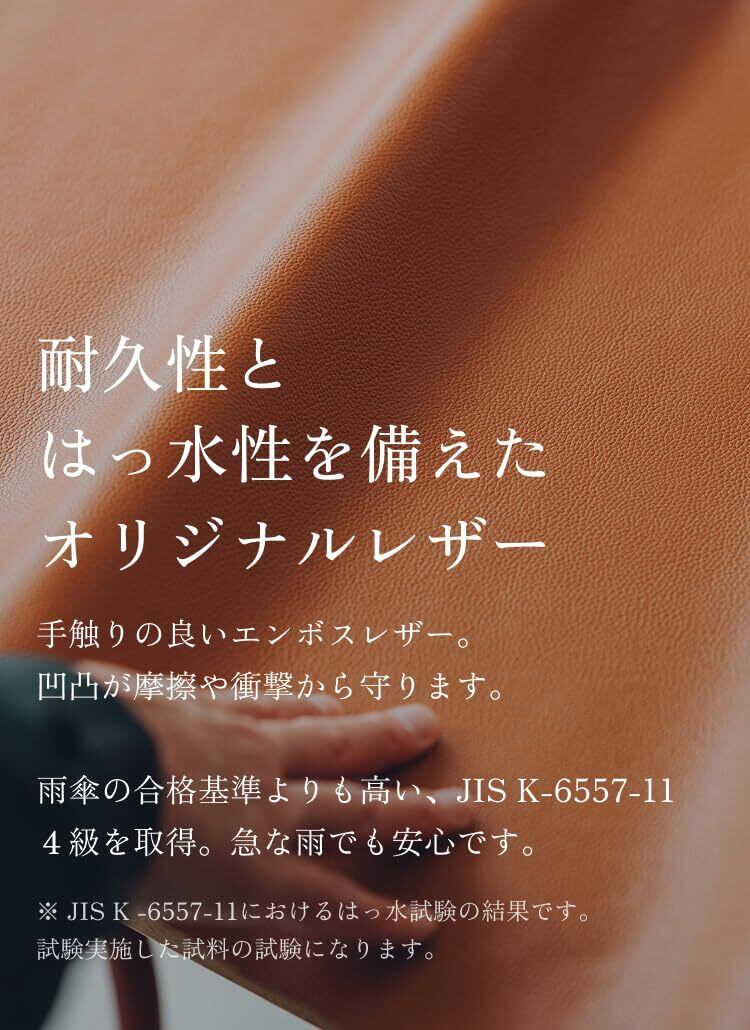【 汚れも傷も付きにくいオリジナル撥水レザー 】牛本革に独自のエンボス加工を加え、キズや汚れが付きにくく、毎日使っても美しさをキープ。JIS K-6557-11の測定試験で 雨傘の合格基準を超える「4級」 を取得しています。※試験実施した試料の試験になります。