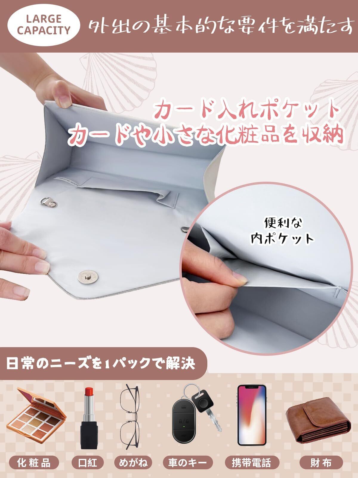 【優秀な収納能力】化粧品、スマートフォン、財布、ハンカチなどの小物を収納でき、カードポケットも付いていて使いやすいです。