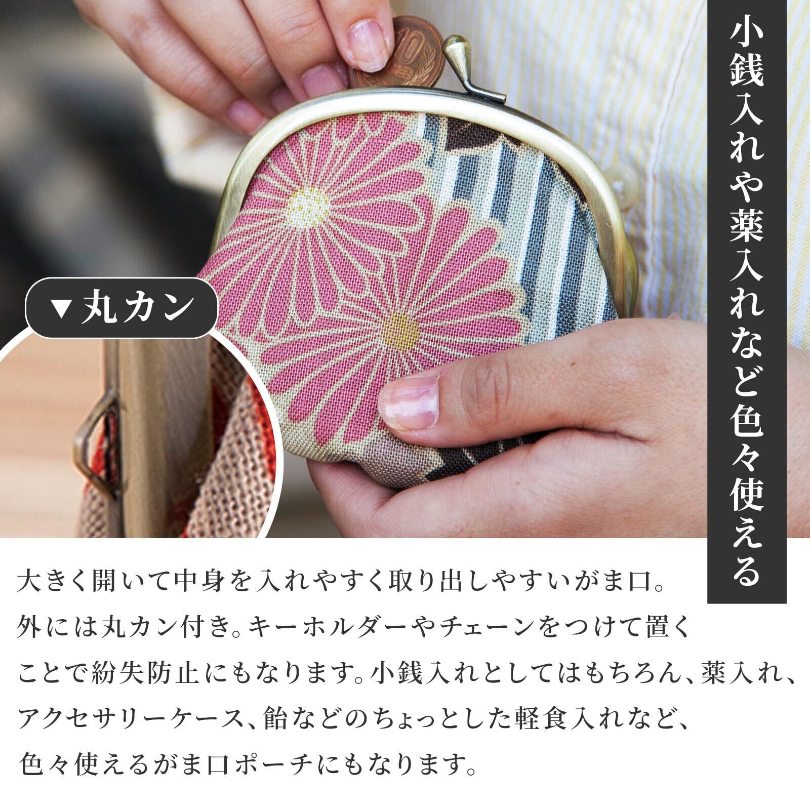 のレン店人気のレトロフラワー生地を使ったがま口小銭入れです。小銭入れとしてはもちろん、小物入れとしてもお使いいただけます。コロンとしたフォルムと3.3寸のサイズ感が可愛らしく、コンビニやスーパーへのお買い物やお賽銭、ウォーキングやジョギング時にちょっとだけお金を入れて持ち歩きたいなど、「ちょっとお金を入れる」のに便利です。浴衣や着物など和装に合わせてもぴったりで、様々なシーンでお使いいただけます。