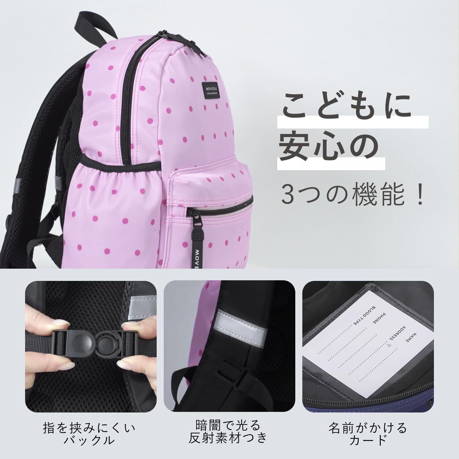 【ズレにくく安心のチェストベルト】 肩ベルトにはバックル付きチェストベルトを採用。 走ったり動いたりしてもリュックがズレにくく、体にしっかりフィットします。 指を挟みにくい設計で、小さなお子様でも安心して着用できます。 肩ベルトの余った紐はゴムバンドでまとめられるため、だらんと垂れず見た目もすっきり。歩行時の引っかかりも防ぎます。