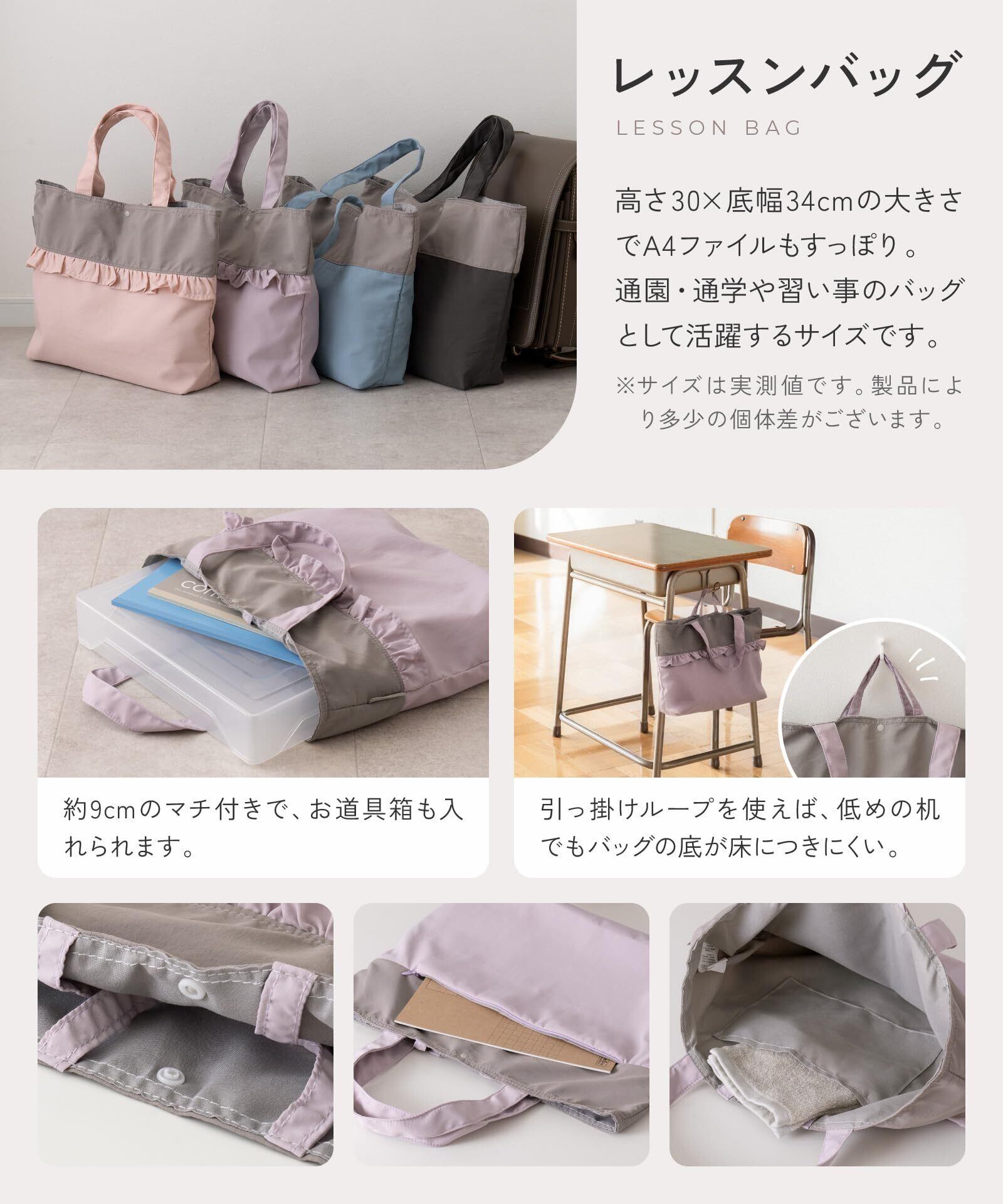 【レッスンバッグ】高さ 約30×底幅 約34cmの大きさでA4ファイルもすっぽり。通園・通学や習い事のバッグとして活躍するサイズです。