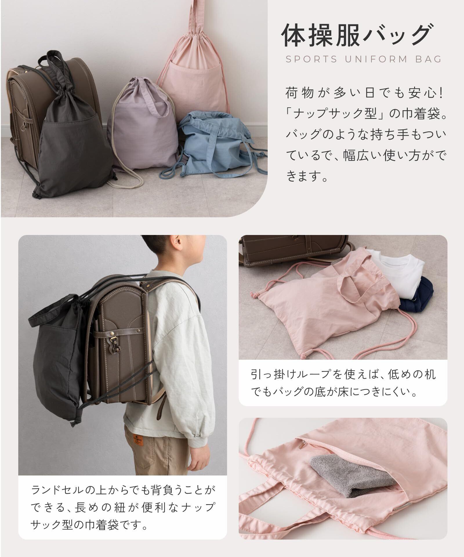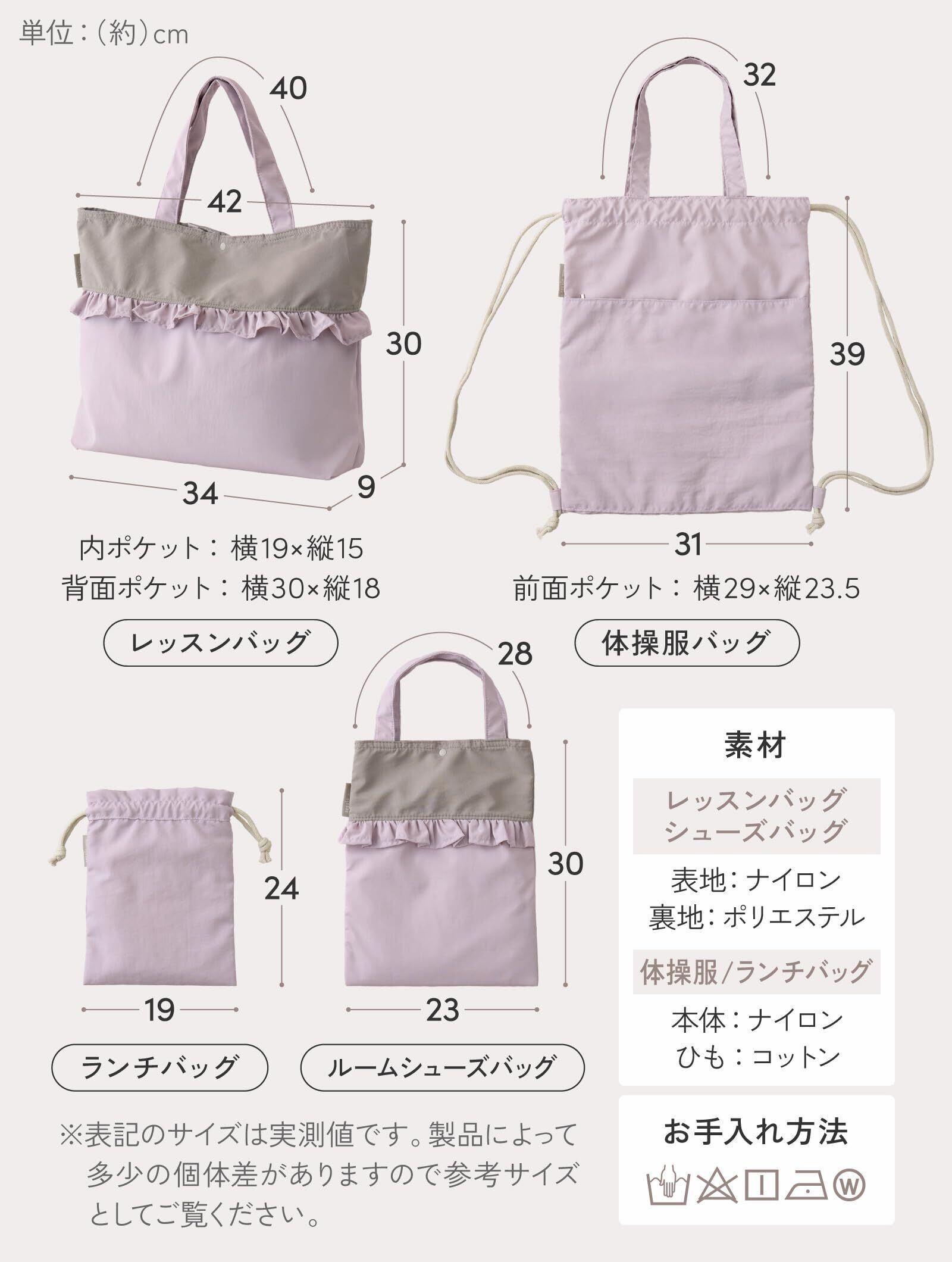 【サイズ(約)】[レッスンバッグ]収納部分:幅42(底幅34cm)×高さ30cm×マチ9cm/持ち手:40cm [ルームシューズバッグ]収納部分:幅23cm×高さ約30cm/持ち手:28cm [体操服バッグ]本体:幅31cm×高さ約39cm/持ち手:32cm/肩紐(片側/最大):90cm [ランチバッグ]本体:幅19cm×高さ24cm