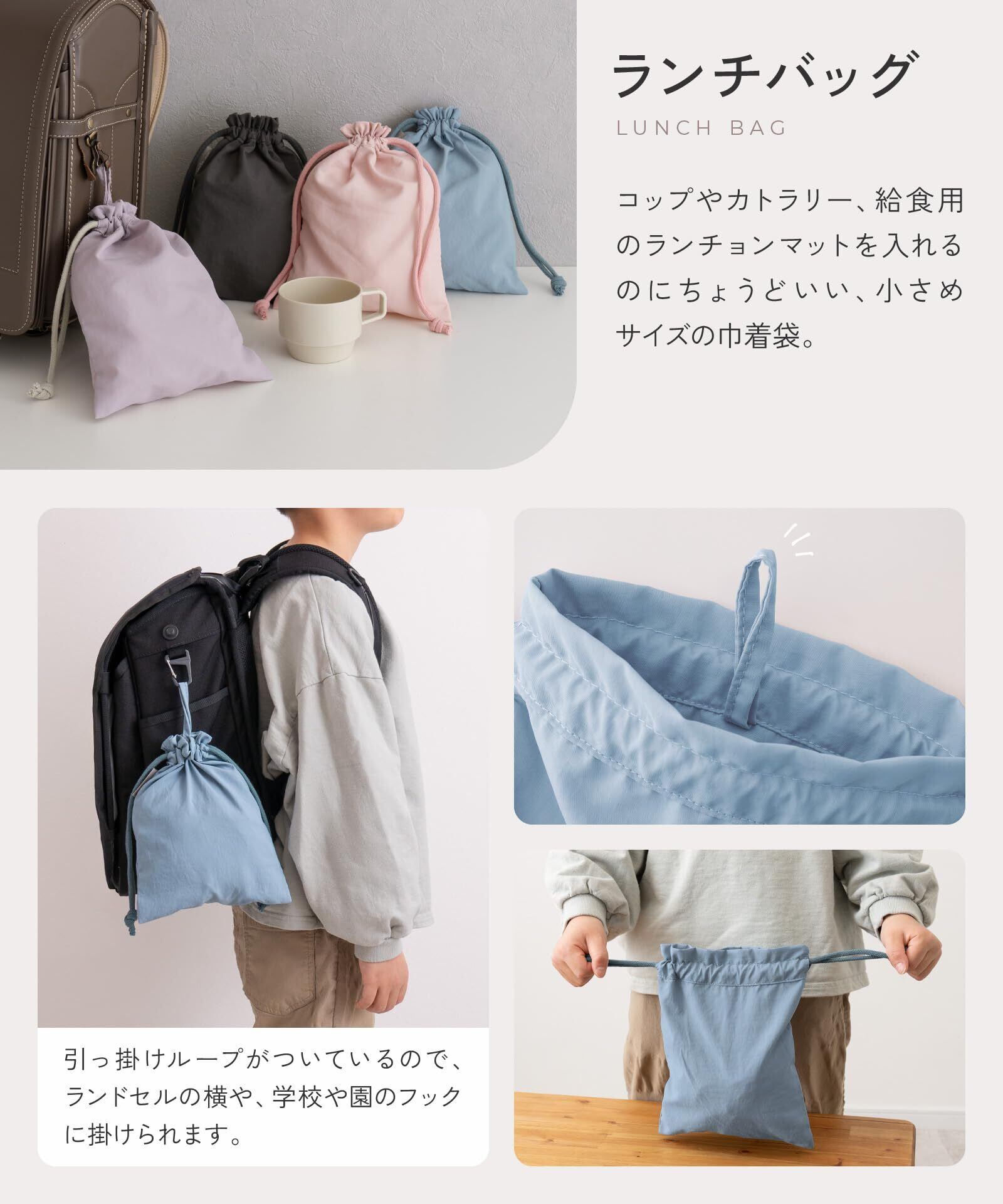 【素材】レッスン/ルームシューズバッグ(表地:ナイロン/裏地:ポリエステル)体操服/ランチバッグ(本体:ナイロン/紐:コットン)