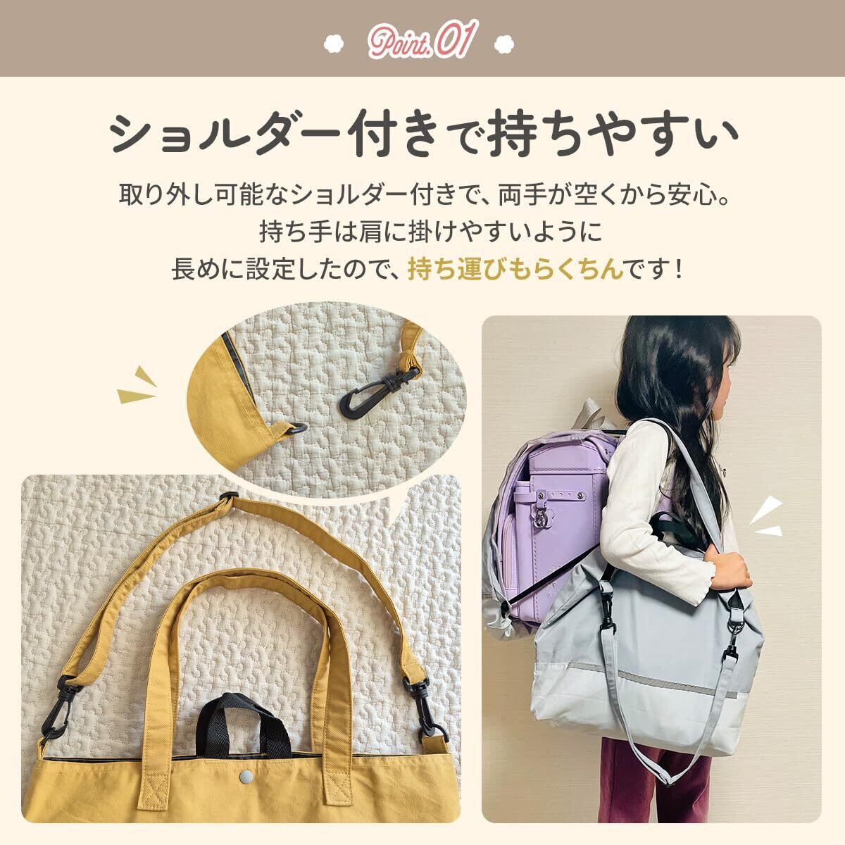 ・対象年齢:小学生 ・組成:綿57% ポリエステル43% ・サイズ:縦33cm×横41cm×マチ10cm 【ショルダー長さ】最長80cm/最短40cm 【持ち手】42cm 【フック用ループ】12cm