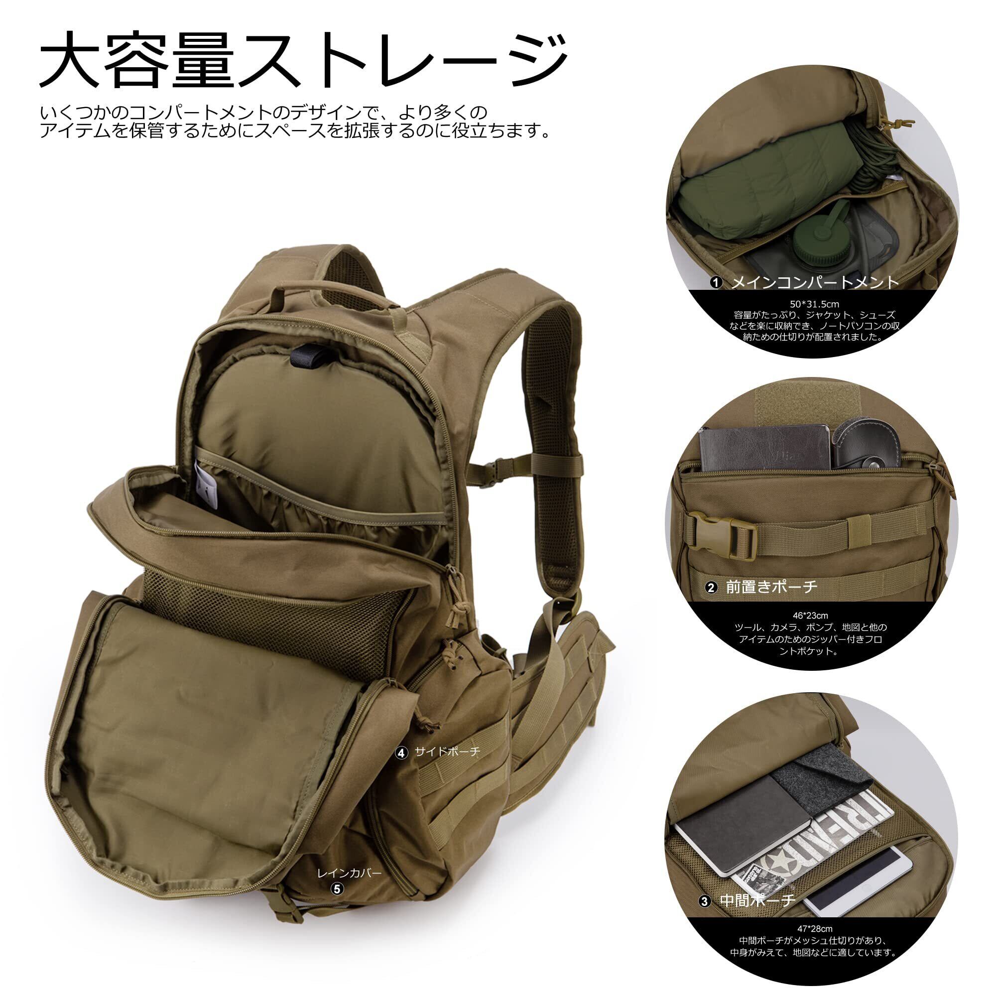 【程よい容量】このミリタリーリュックには、2.5リットルのウォーターバッグを入れることができるハイドレーションコンパートメントがあります。また、15.6インチのラップトップの保管もできます。