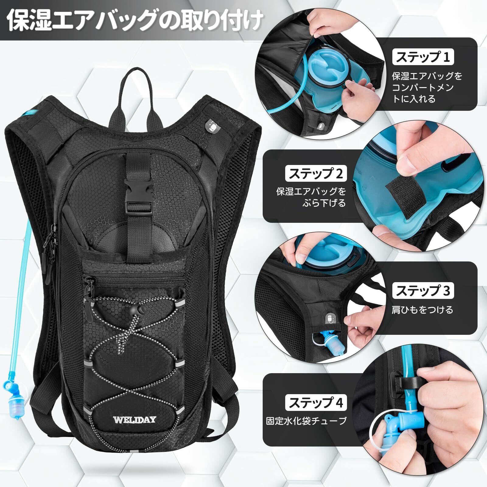 【ダイナミックフィットシステム】ウォーターバッグバックパックの背面には、柔らかく通気性に優れたメッシュデザインを採用しています。人間工学に基づいたデザインは、重量を均等に分散し、圧力を軽減し、疲労を軽減します。汗や湿気を素早く排出し、長距離ランニングや登山中の背中をドライに保ち、ムレやベタつきを解消し、疲労を大幅に軽減します。