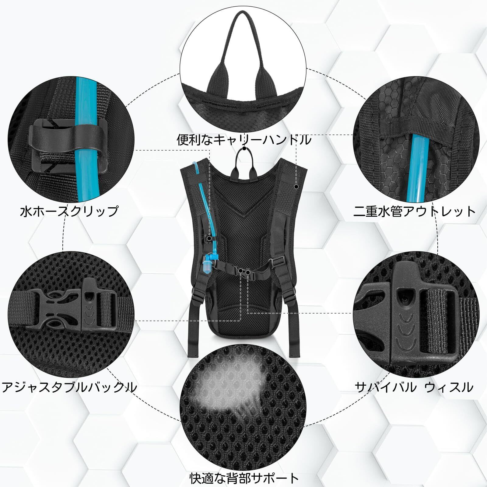 【軽量で頑丈】このウォーターバッグバックパックは、高度な耐裂性ナイロン素材で作られており、耐久性と超軽量で持ち運びに便利です。一日中ハイキング、ランニング、サイクリングを楽しむのに最適です。サイズは9.45 x 1.77 x 15.75インチで、人間工学に基づいて設計されています。調節可能なショルダーストラップ、チェストストラップ、ウエストベルトは体の曲線にぴったりフィットし、バックパックが体にしっかりと快適にフィットします。このデザインは肩や背中への負担を軽減し、長時間の移動でもリラックスして、より遠く、より高く登ることができます。