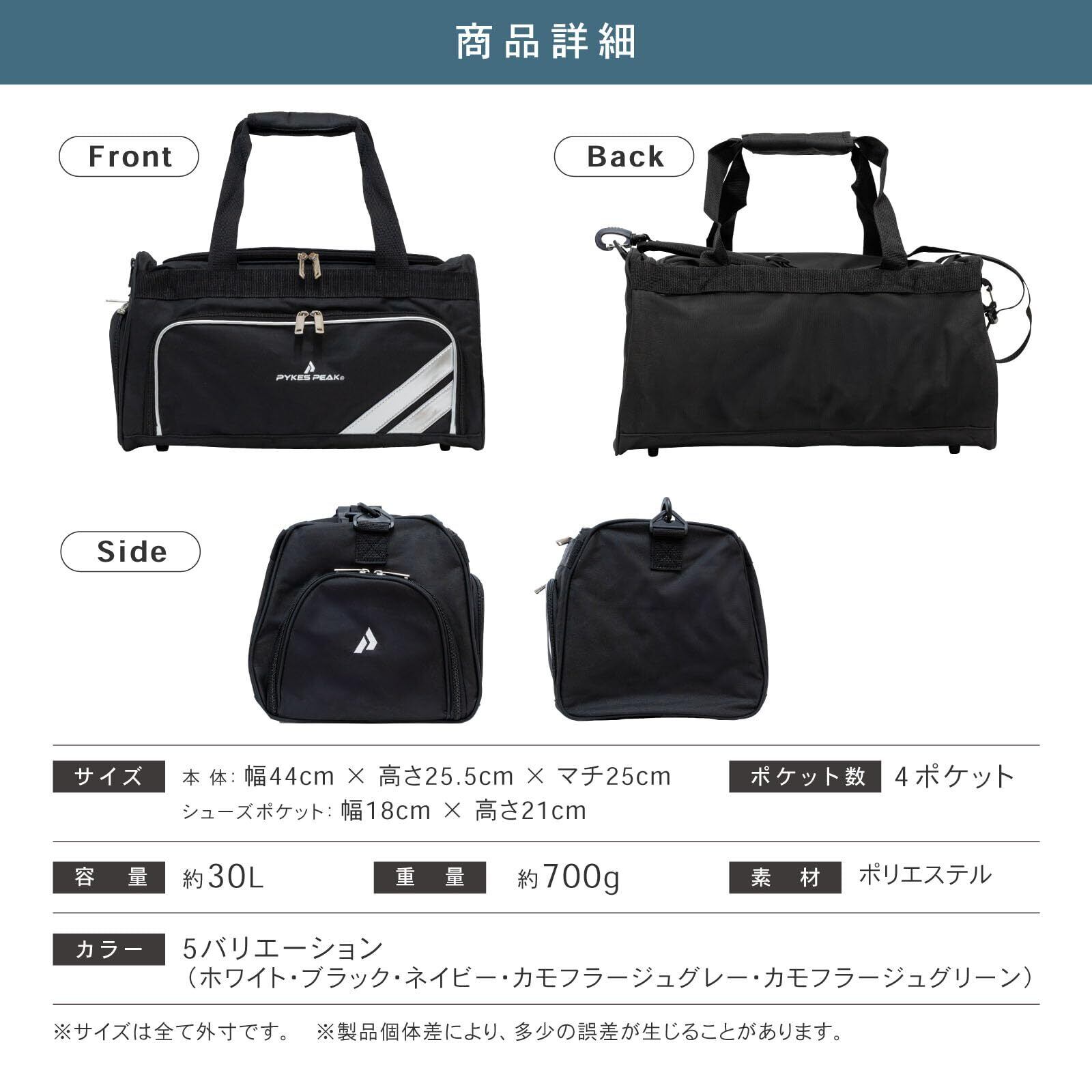 【素材 / カラー / サイズ】素材:ポリエステル/カラー:ブラック、ホワイト、ネイビー、カモフラージュ(1,2) 全5色で豊富に品揃えいたしております。ゴルフウェアやスポーツウェアに合わせたお好みのカラーをお選びください。サイズ:W440×H255×D250mm 約30L収納。PYKES PEAK(パイクスピーク)は国内メーカーで、担当スタッフが丁寧に対応させて頂きますので、初期不良や故障など気軽にご連絡くださいませ。