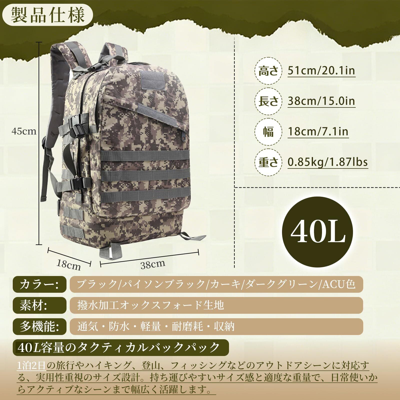 【仕様】ブラック / パイソンブラック / カーキ / ダークグリーン / ACU/陸自迷彩の6色展開。容量約40L、サイズ約38×51×18cm、重量約0.85kg。耐水性に優れた600Dポリエステル素材を使用した、タフで実用性の高いミリタリーバックパックです。