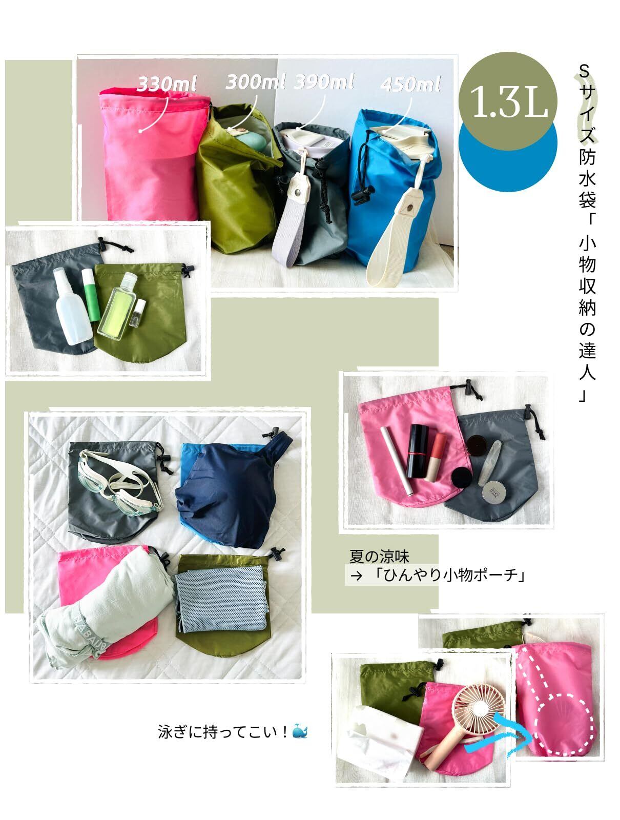 サイズ別活用術: Mサイズは薄手ダウンやネックピローのコンパクト収納に、Sサイズは水着・化粧品・デジタル小物・水筒の分類に◎。一つのセットで収納の柔軟性が大幅アップ!