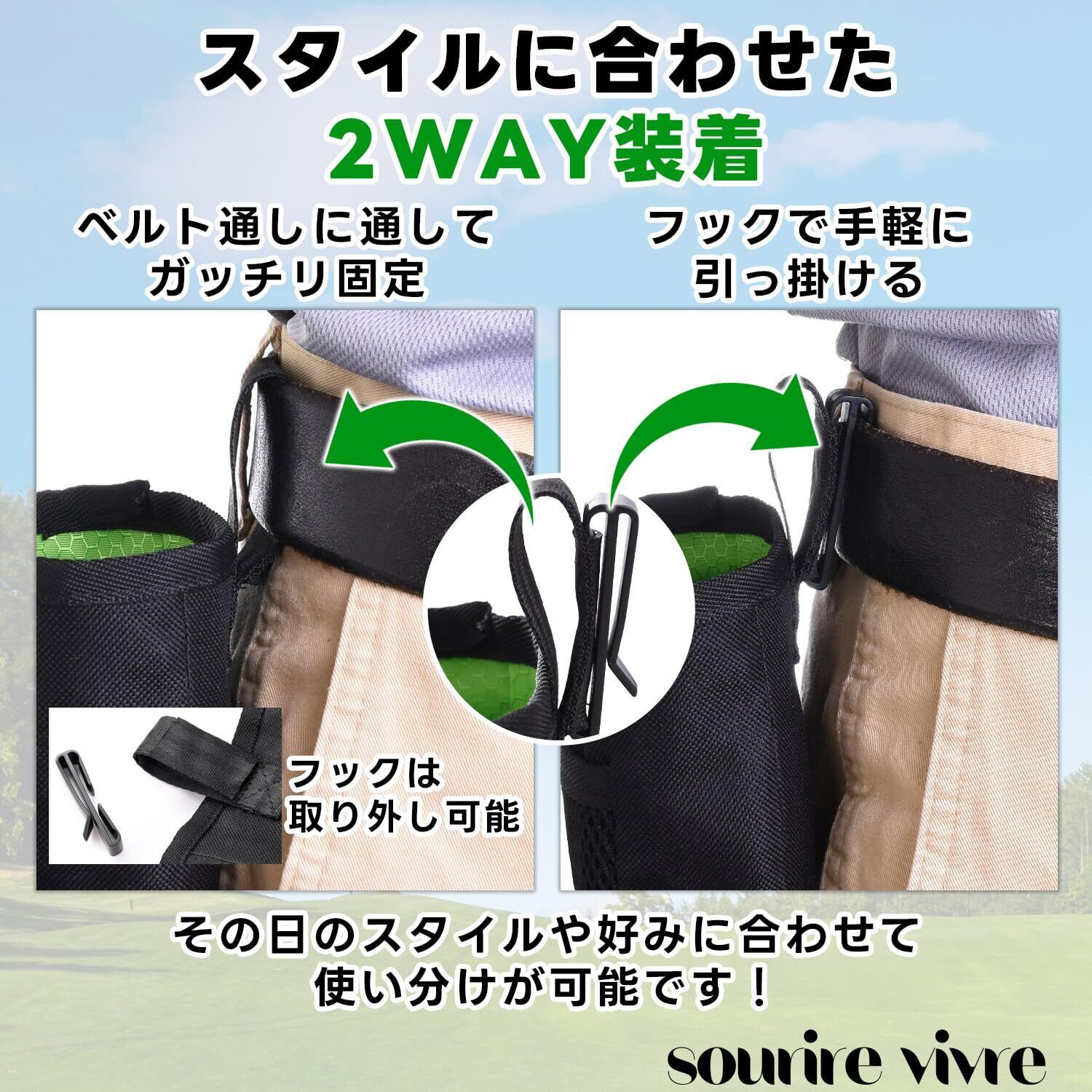 【スタイルに合わせた2WAY装着】背面にはベルト固定ができる通し穴と手軽に引っ掛けるクリップフックの両方を装備。パンツの腰回りに合わせて使い分けができスイング時もブラブラしにくい設計です。(※フックは取り外し可能)