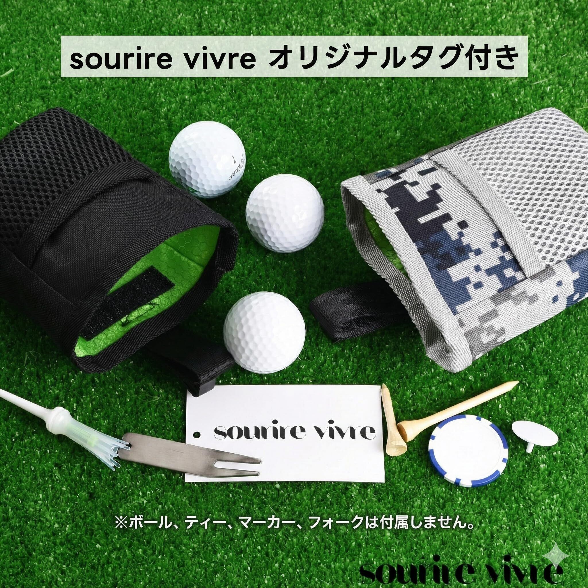 【推奨ボール3個と小物の黄金比】ボールだけなら最大4個入りますが、推奨はボール3個とティーやマーカーなどの収納です。前面のメッシュポケットは視認性が高くマルチボールポーチとして男性女性問わず活躍します。