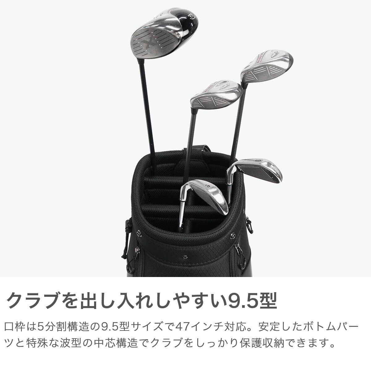 耐久性の高いポリエステル素材とPU素材を組み合わせたカート型キャディバッグ。グリップ力あるハンドルとパッド入りショルダーで快適に持ち運び可能です。安定したボトムパーツと特殊な波型の中芯構造でクラブをしっかりと収納してくれます。部分使いのエナメルがアクセントとなり、ラウンド中も存在感を放つスタイリッシュなデザインです。