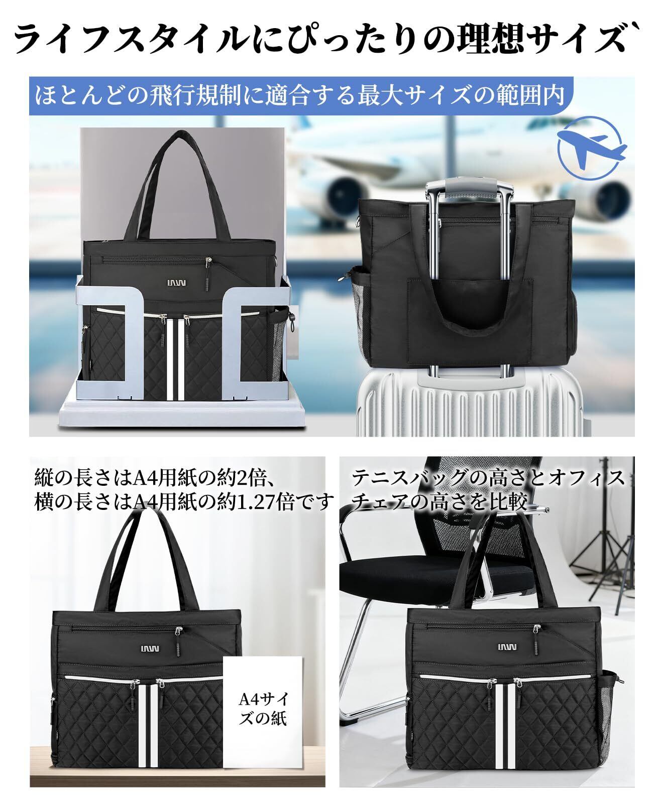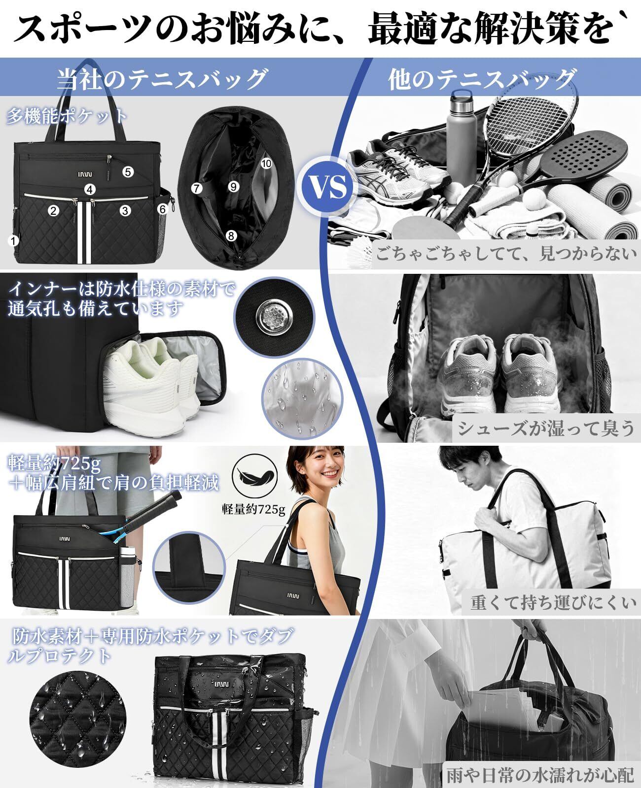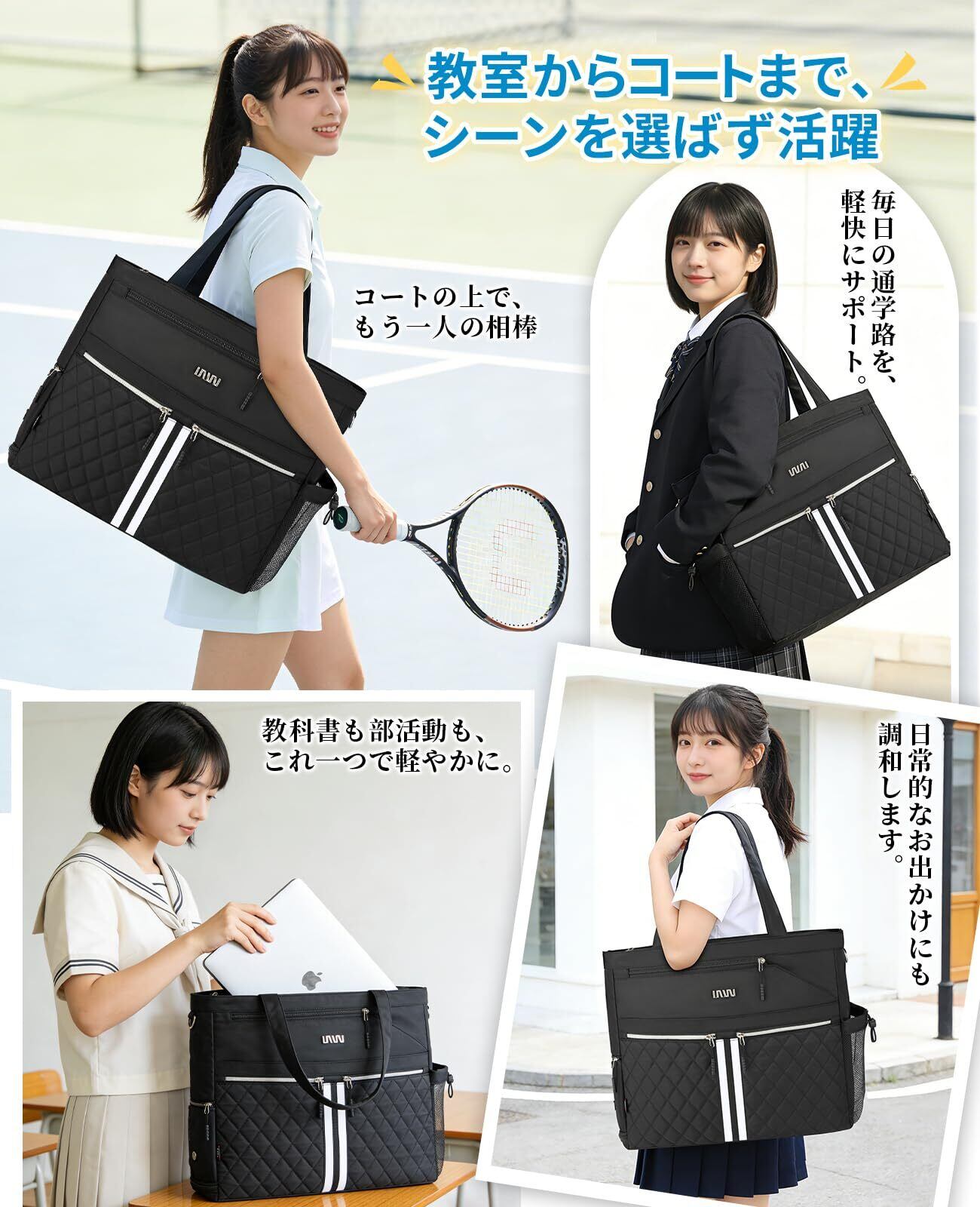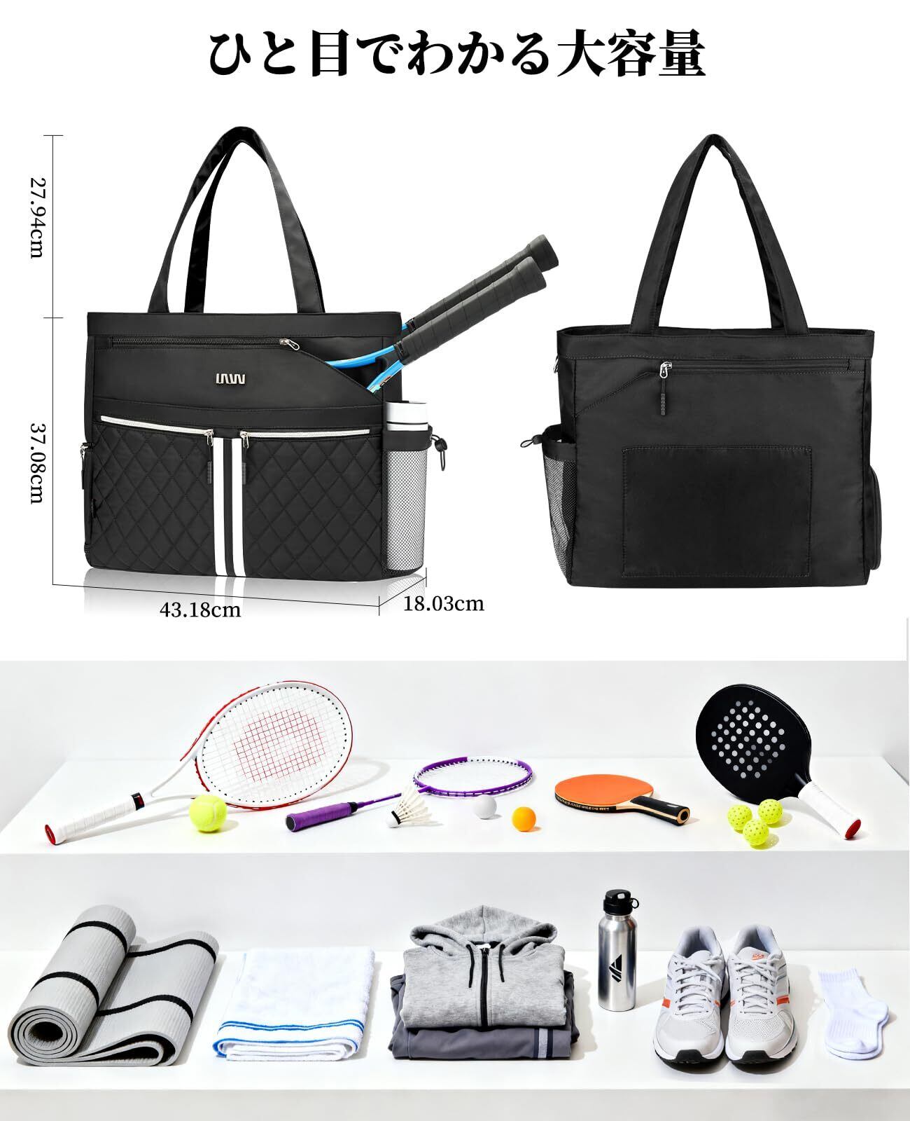 テニストートバッグ(シューズ収納付き)大型キルティング ピックルボールバッグ 防水・軽量 男女兼用ジムバッグ