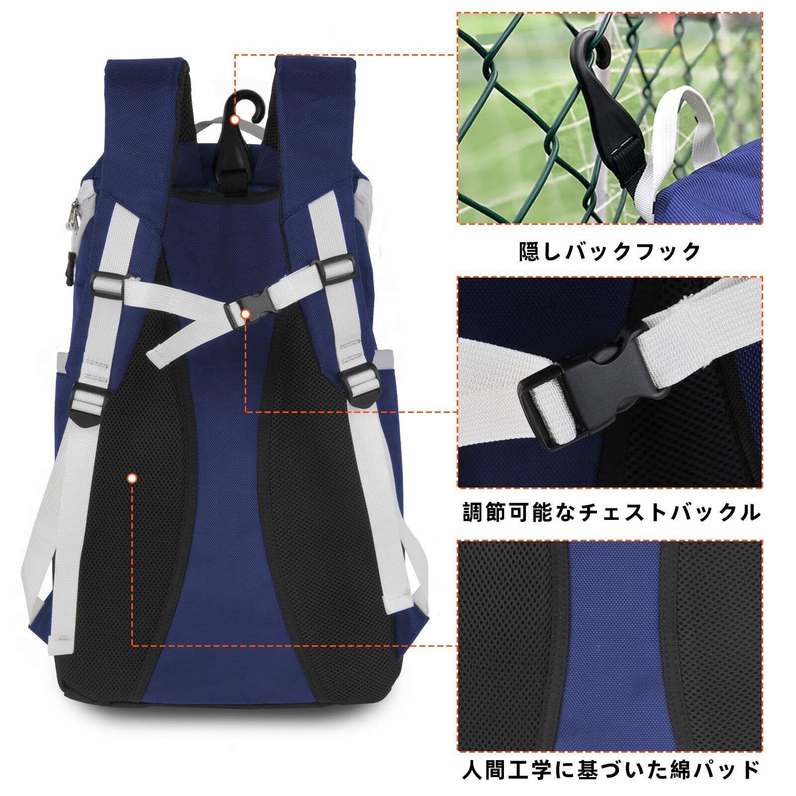 【優れたデザイン】①外部ヘルメットホルダー付き!野球ヘルメットをバッグの外側に収納できます。野球用具や日用品を収納できるスペースが広がります。②底部にある隔離換気された靴コンパートメントは、靴を他のアイテムから分離します。③HANANAの野球リュックには、隠しフェンスフックが付き、スポーツをするとき、バックパックを自由にフェンスなどに吊るすことができます。④ショルダーベルトの部分にアジャスターバックル付き、チェストベルトの設計で、背負う時、肩からずり落ちるという悩みを解消し、両手を解放できます。それに、より安定してリュックを身体に固定することが出来ます。⑤強化されたクッション性と耐衝撃性のある背面、6mmのパッドが付きウエストサポートです。より一層身体に負担をかけるのを軽減します。