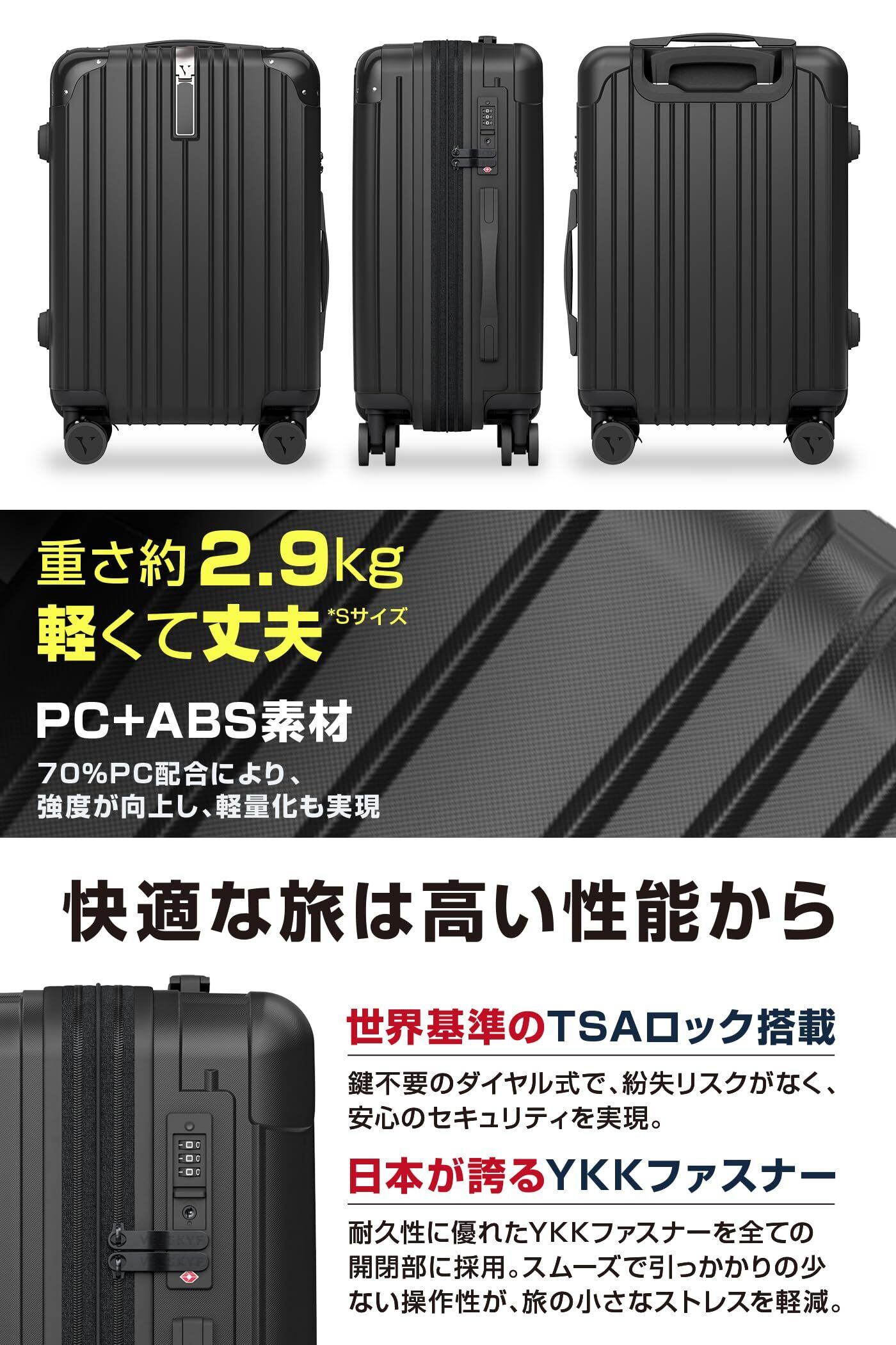 【 驚くほど軽量、頑丈なボディ 】Sサイズ2.9kg Mサイズ3.8kg Lサイズ4.4kg 持った瞬間、思わず声がでるほどの軽さに仕上げ、PC70%( ポリカーボネイト )+ABS樹脂30%の混合比で作られた頑丈なボディです 【 キャスター音 軽減 】キャスター部に特殊な材質を採用しアスファルト上でも回転摩擦音を低減しました