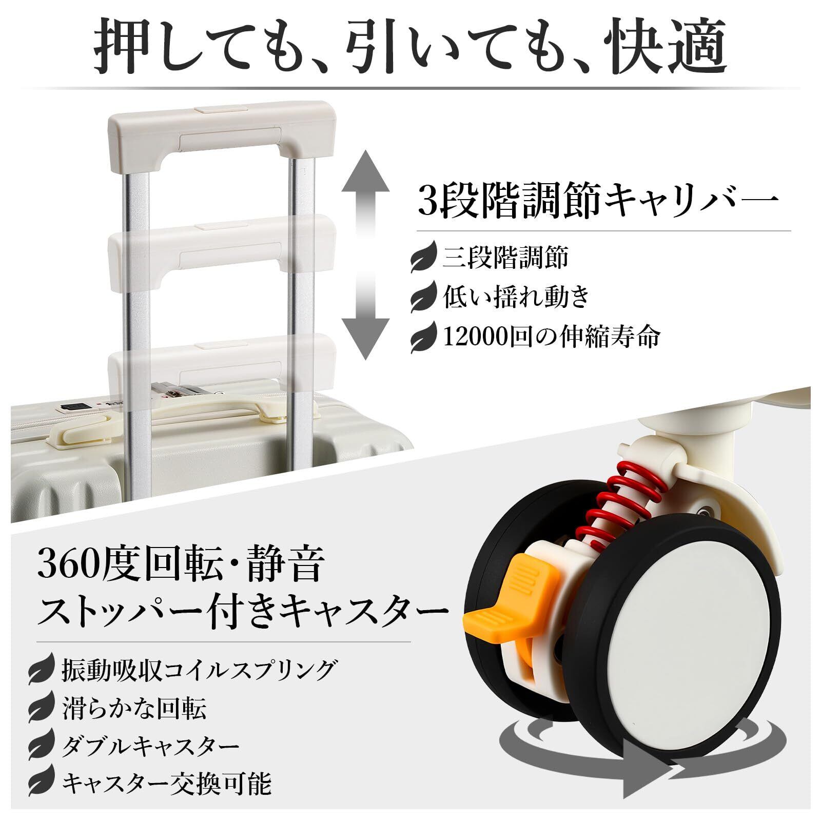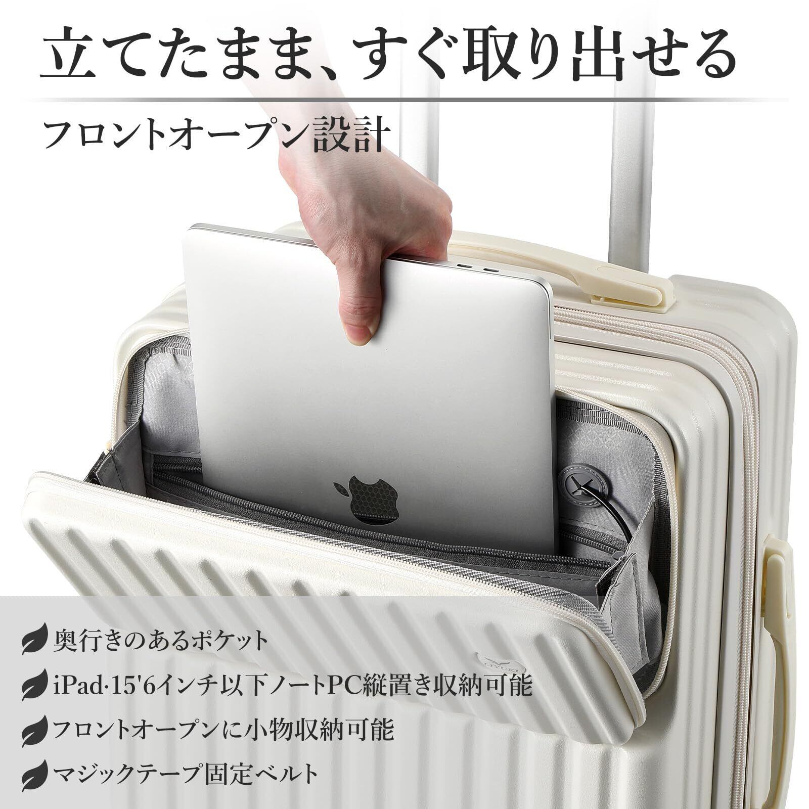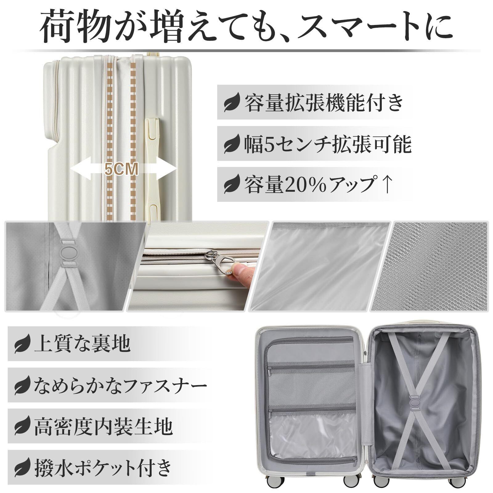【2022最新】スーツケース キャリーケース 2026年新モデル フロントオープン 機内持込対応 Sサイズ 軽量 拡張機能付 静音キャスター ストッパー付 多機能 旅行 出張(アイボリー/1~3泊)