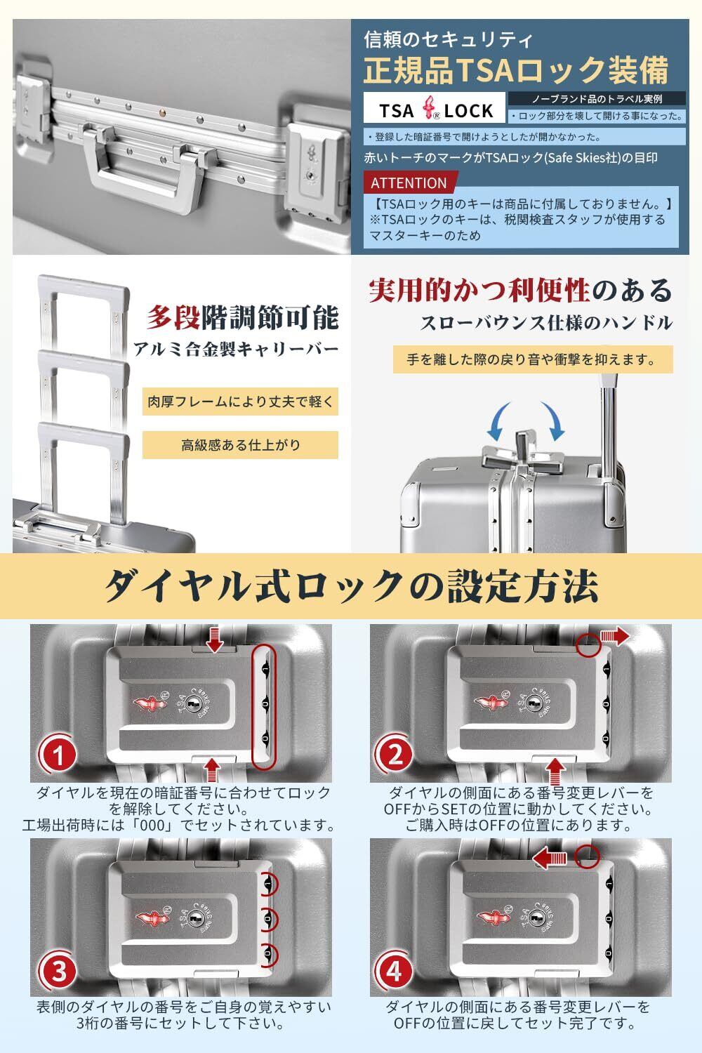 【耐水アルミフレーム&TSAロック搭載】耐水性に優れたアルミフレーム構造で、雨天時の移動も安心。 さらに、スマートフォンなどにも採用されている陽極酸化処理(アルマイト加工)を施すことで、 表面硬度と耐摩耗性を高め、キズが付きにくい仕上がりを実現しました。 発色性にも優れており、上質で洗練されたカラー表現をお楽しみいただけます。 TSAロックを標準装備しており、海外旅行・出張時も安全にお使いいただけます。米国運輸保安局認可でセキュリティ面も万全です。