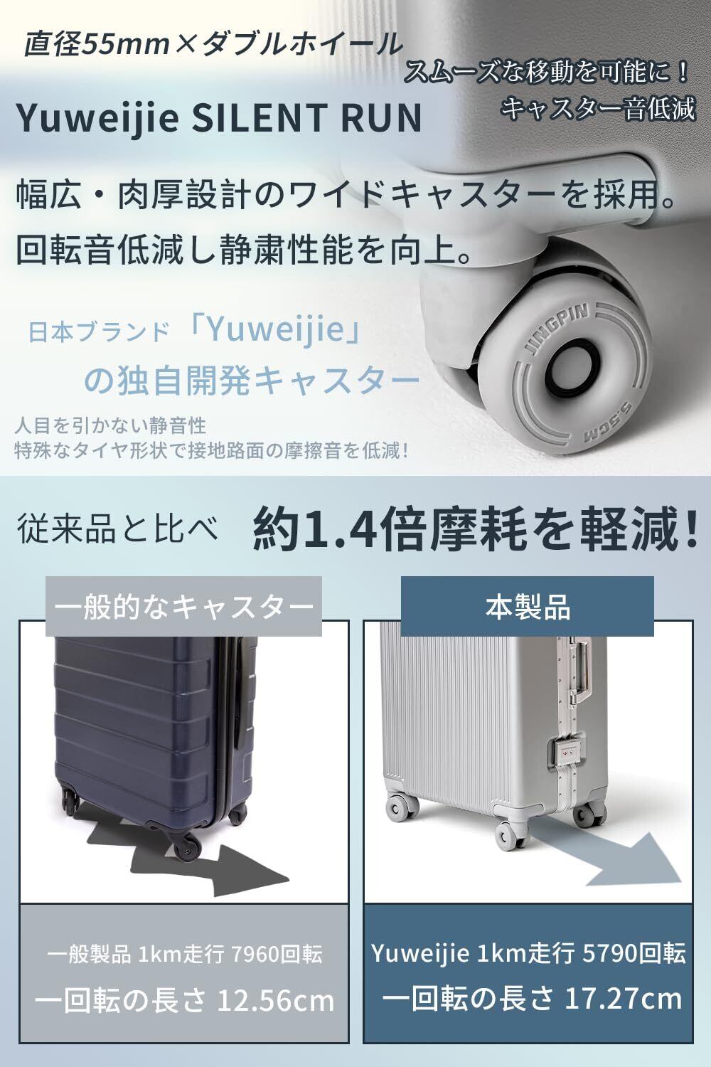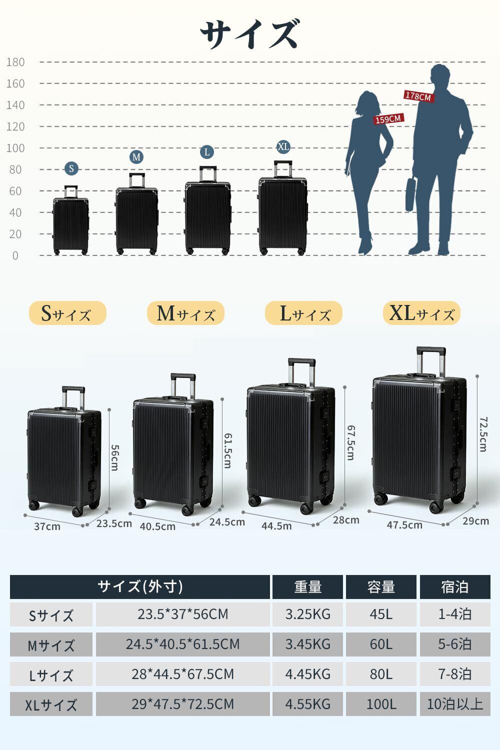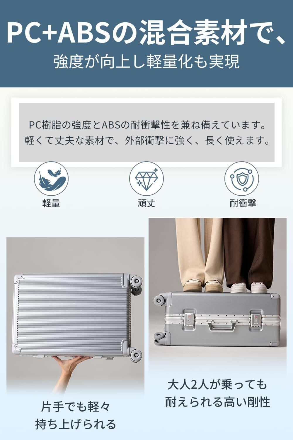 【高耐久ABS+PC素材&アルミフレームタイプスーツケース】ボディには軽量かつ高強度なABS+PC素材を採用。 持ち運びやすさと耐久性を両立し、移動の多い旅行でも扱いやすい設計です。 さらに、アルミフレーム構造とリベット補強により、 輸送中の衝撃や荷重にも耐え、預け入れ時も変形・破損しにくく安心。 長期間にわたり、安心してご使用いただける耐久設計です。