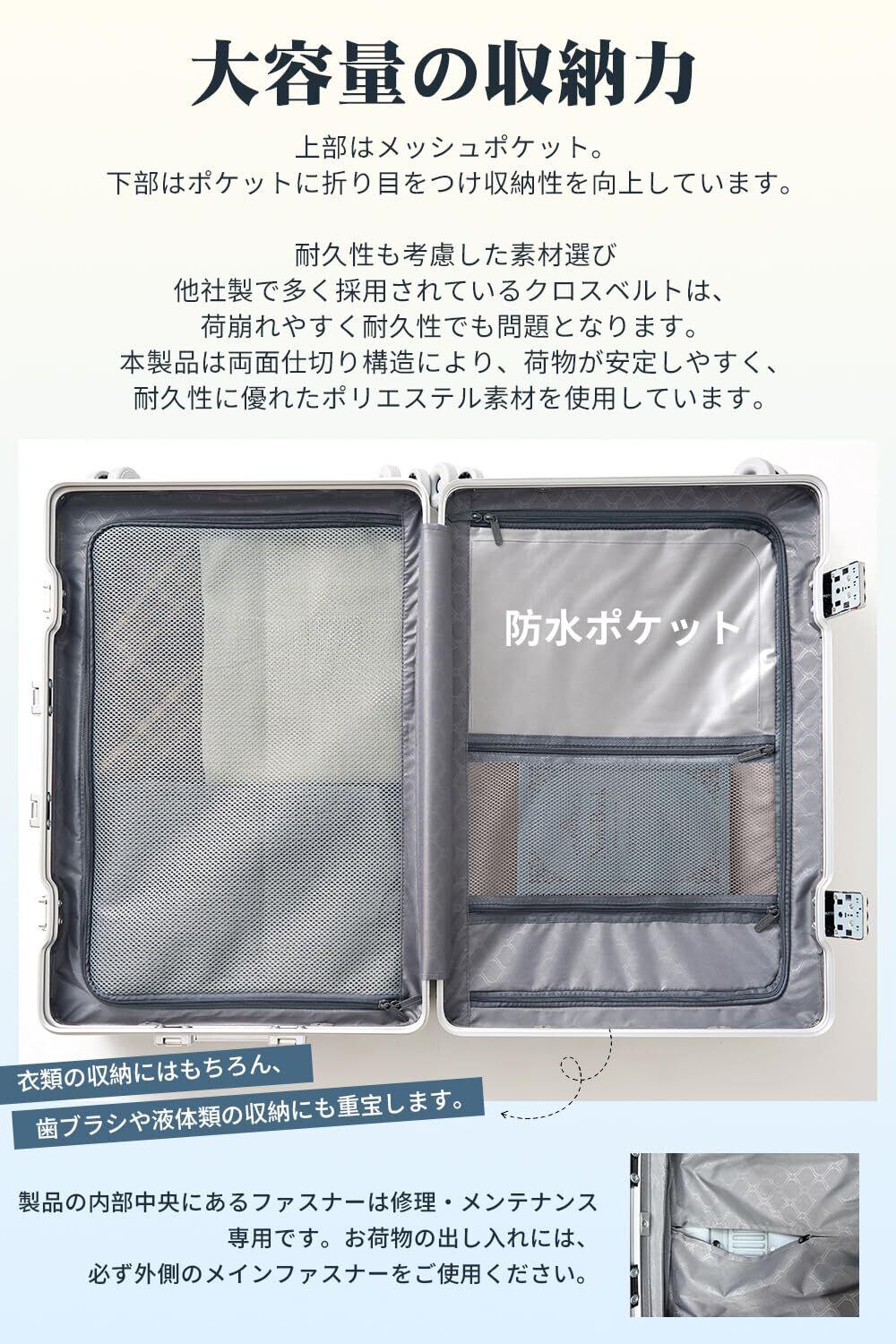【収納力とデザイン性を両立した内装設計】内装は旅行中の荷物整理を想定した仕切り付き構造で、 衣類や小物を分けて収納しやすく、移動中でも中身が崩れにくい設計です。 メッシュポケットを備え、開閉時も一目で確認できます。 また、ご購入日より2年間のが付いております。 通常のご使用において発生した不具合につきましては、期間内であれば無償で修理または部品交換/返金対応を行います。