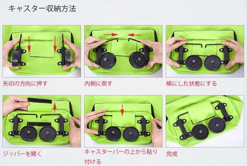 便利なキャスター装備・ワンタッチ切り替え:こちらの キャリーカート 折りたたみ エコバッグ は、折りたたんで収納できるキャスターを装備しています。バッグの中にモノがたくさん入っているときは、2輪タイヤの付いたキャスターで持ち運ぶことが出来ます。キャスターを使わないときはワンタッチで折りたたんで収納することもできるので、軽い荷物のときは肩や腕に掛けてバッグとして、重い荷物のときはキャリーカートとしてなど、必要に応じて簡単に切り替えて利用できるので手間もかかりません。