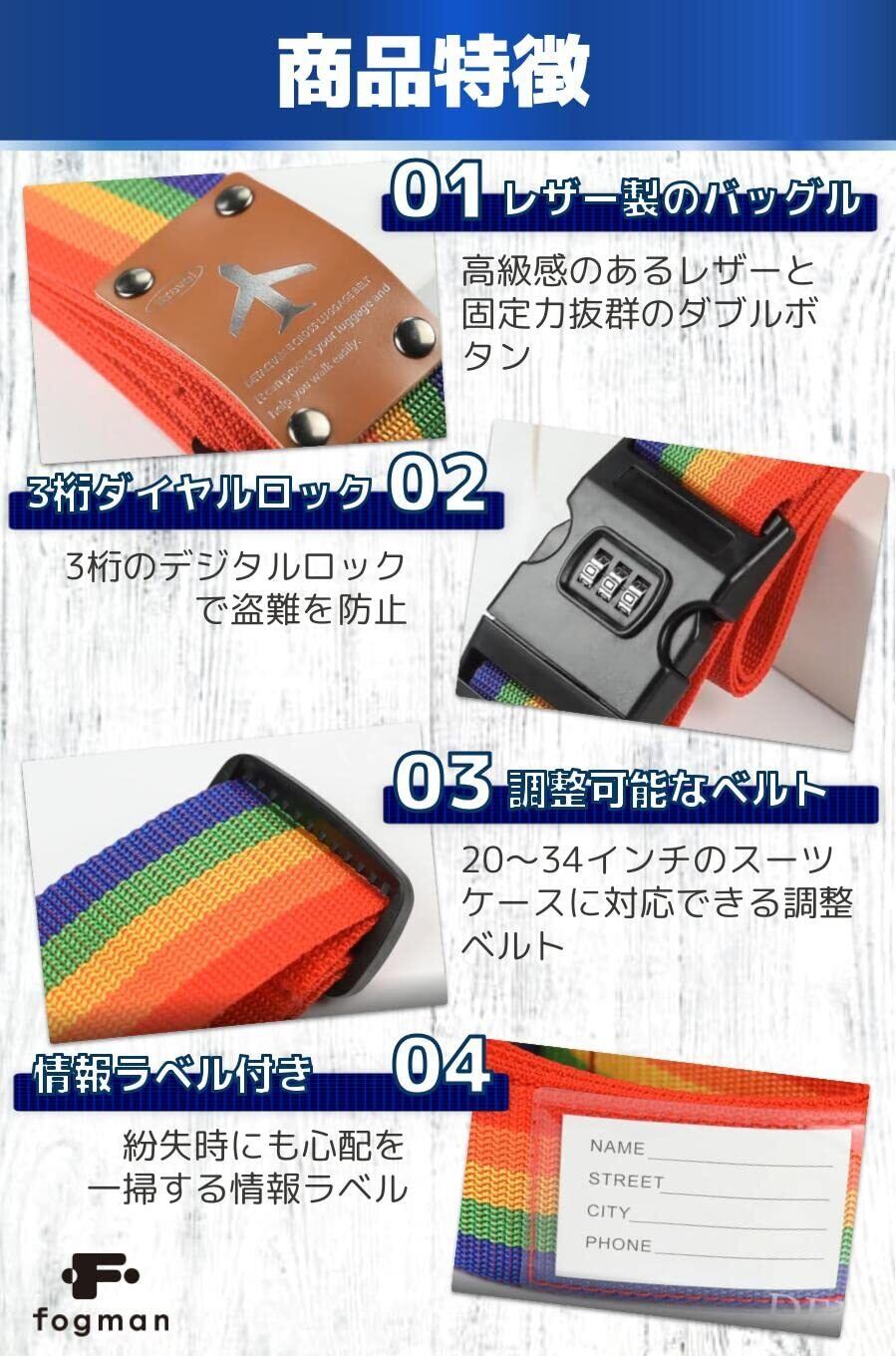 【新着商品】fogman スーツケースベルト 鍵付き ロック 十字 3桁ダイヤル式 収納袋付き 2本セット (レインボー)
