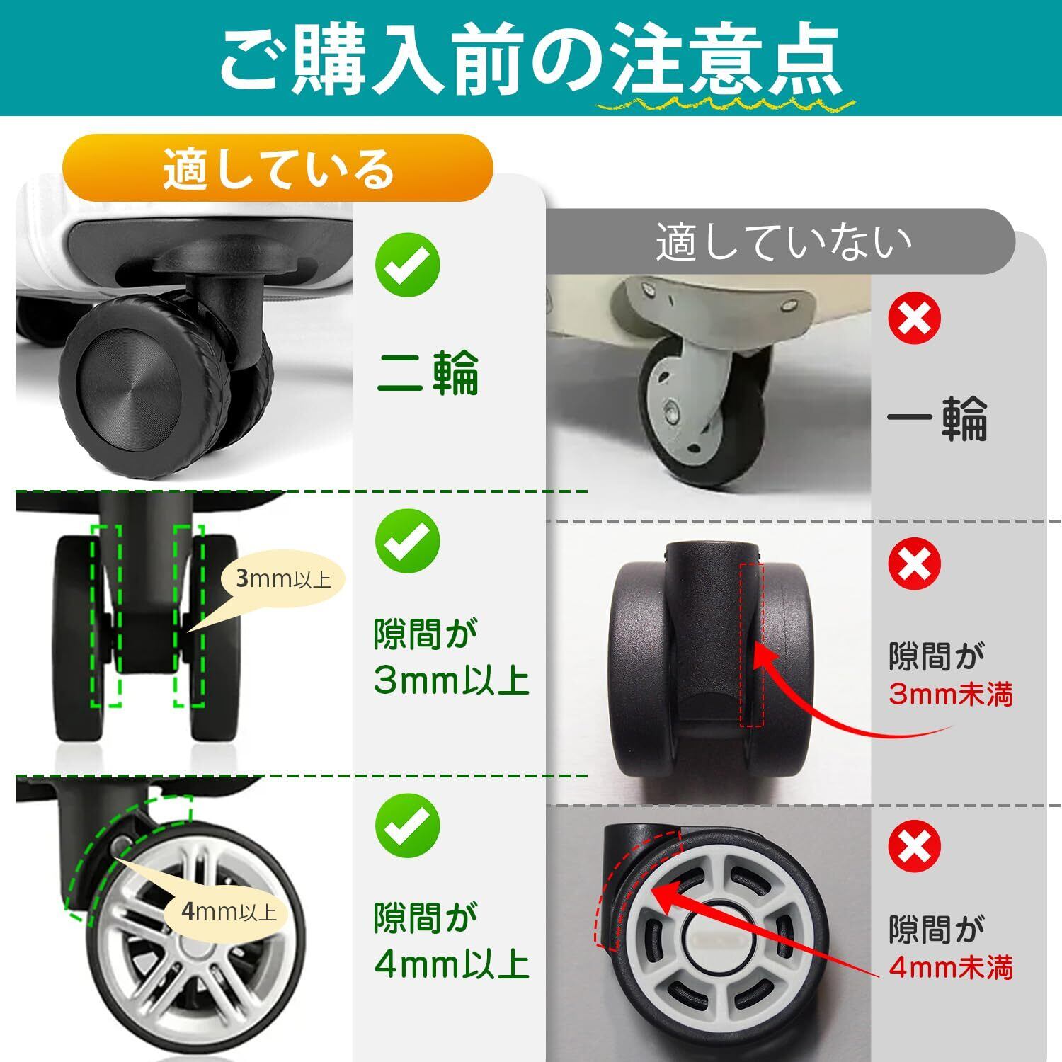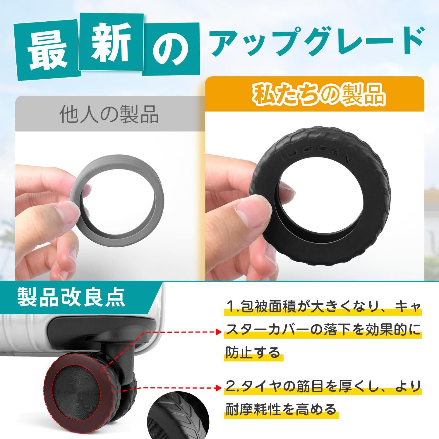 【騒音低減 ざまざまの路面に対応可能】キャリーケース 車輪カバー はスーツケースの走行時の騒音を抑え、静かな旅行を実現します。長期旅行や出張においても、キャスターカバーはスーツケースの最適なパートナーです。あらゆる悪路からキャスターをしっかり守り、雨の日でも使える