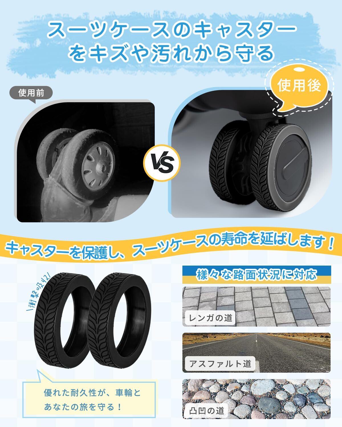 【ご購入前にご確認ください】①本製品はダブルホイール型キャスター専用です、片輪キャスターには対応できません。②ご購入前に、定規でスーツケースの車輪の直径を測り、車輪と車軸の間隔が3mm以上、車輪とフェンダーの間隔が4mm以上あることをご確認ください。測定結果に基づいて、車輪のサイズに合ったキャスターカバーをお選びいただき、最高の旅行体験をお楽しみください。
