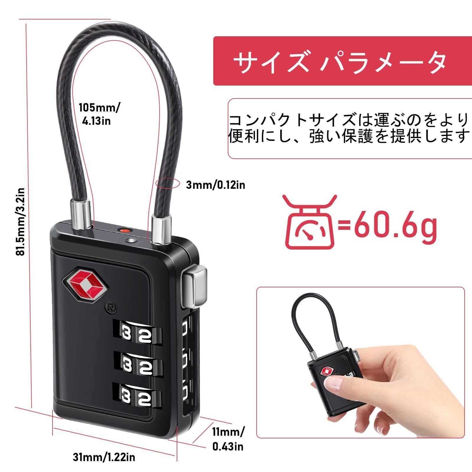 特徴 TSA認証, パスコードロック解除, リセット可能, 耐切創性, 耐引っかき性