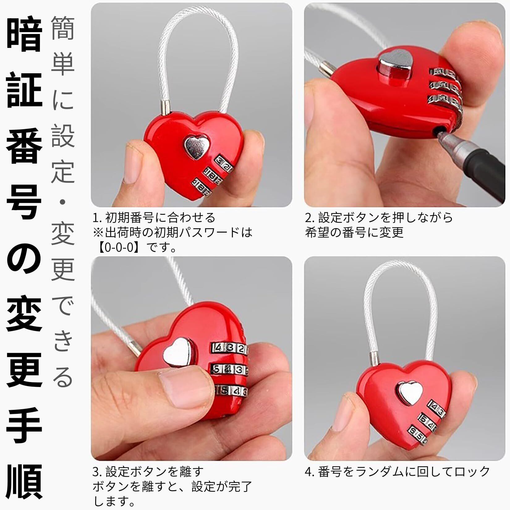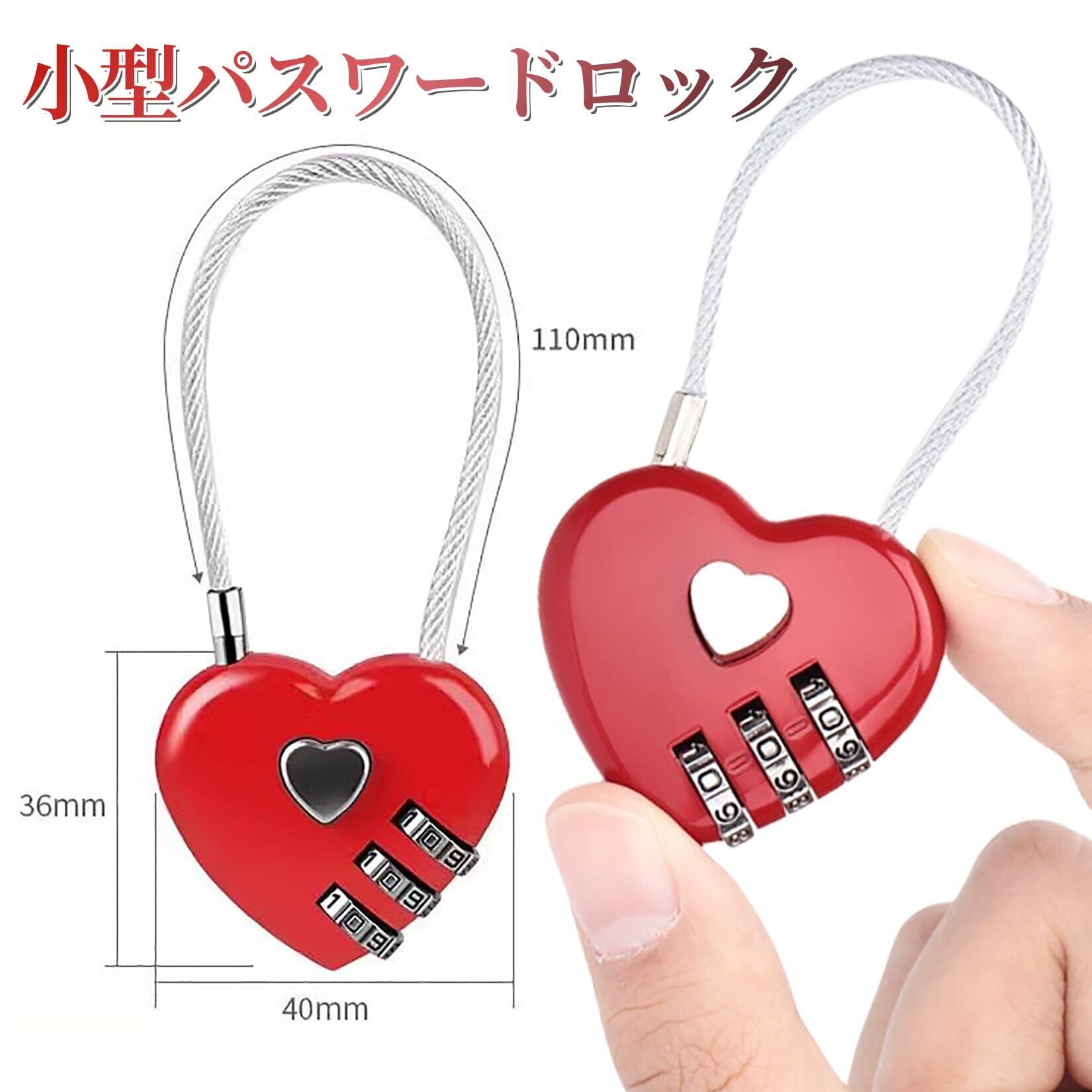 ハート型のデザインがとってもキュートな、3桁ダイヤル式のワイヤー南京錠です。ラブリーなカラーが目を引き、旅行バッグや学校ロッカー、パーソナル収納にぴったり。