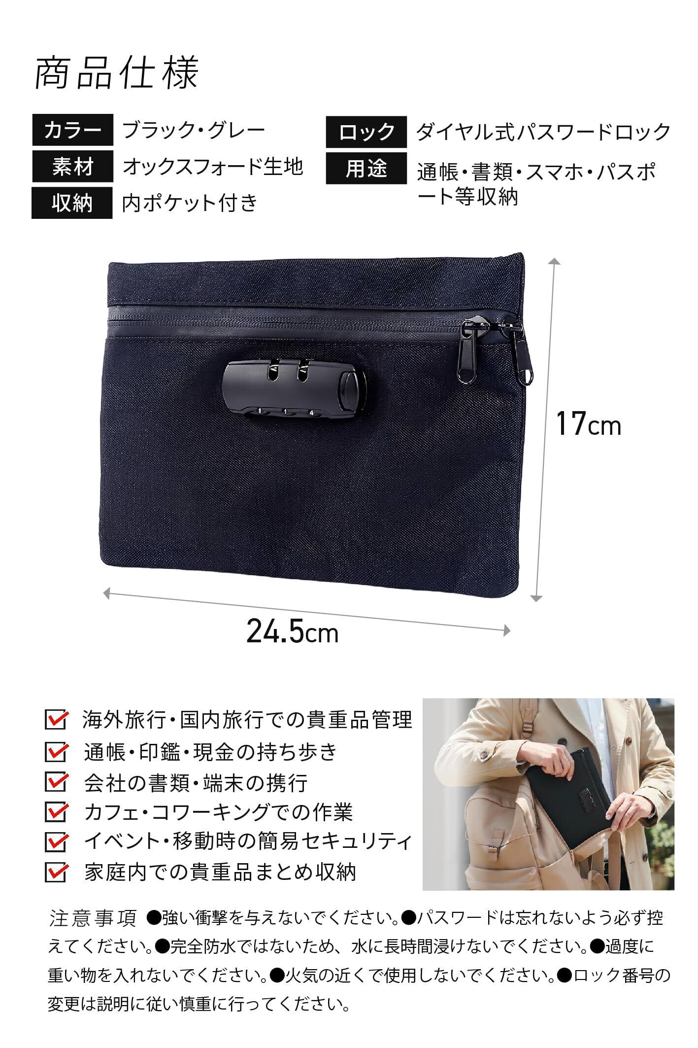 【商品仕様】 素材:600D牛津布/サイズ:24×16.5cm/重量:約150g/カラー:ブラック/仕様:防水・防湿・防臭/暗証番号ロック付き
