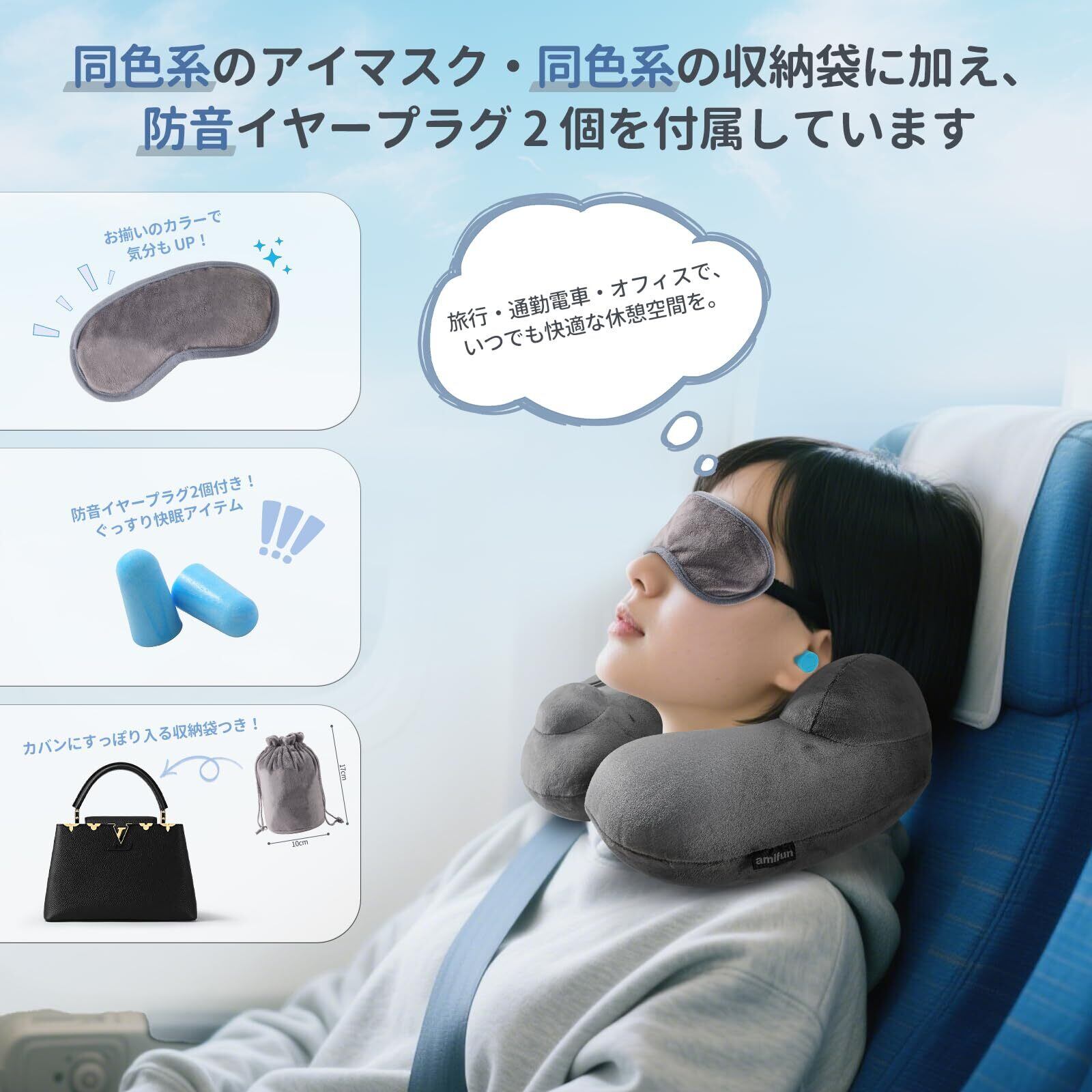 4.【オールインワン・旅行にすぐ使える充実セット】 ネックピローに加え、同色収納袋・アイマスク・遮音イヤープラグ2個が付属。光と音を遮断し、移動中でもやすらぐ休息空間がすぐに作れます。収納時はコンパクトになり、かさばらない軽量設計で、記憶枕よりはるかに携帯性が高いです