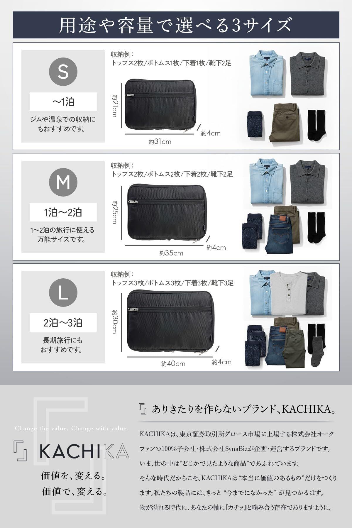 【用途に合わせて選べる3サイズ展開】 宿泊日数や用途に応じて選べるS・M・Lの3サイズ展開。スーツケース収納はもちろん、バッグインバッグやクラッチバッグとしても活躍します。