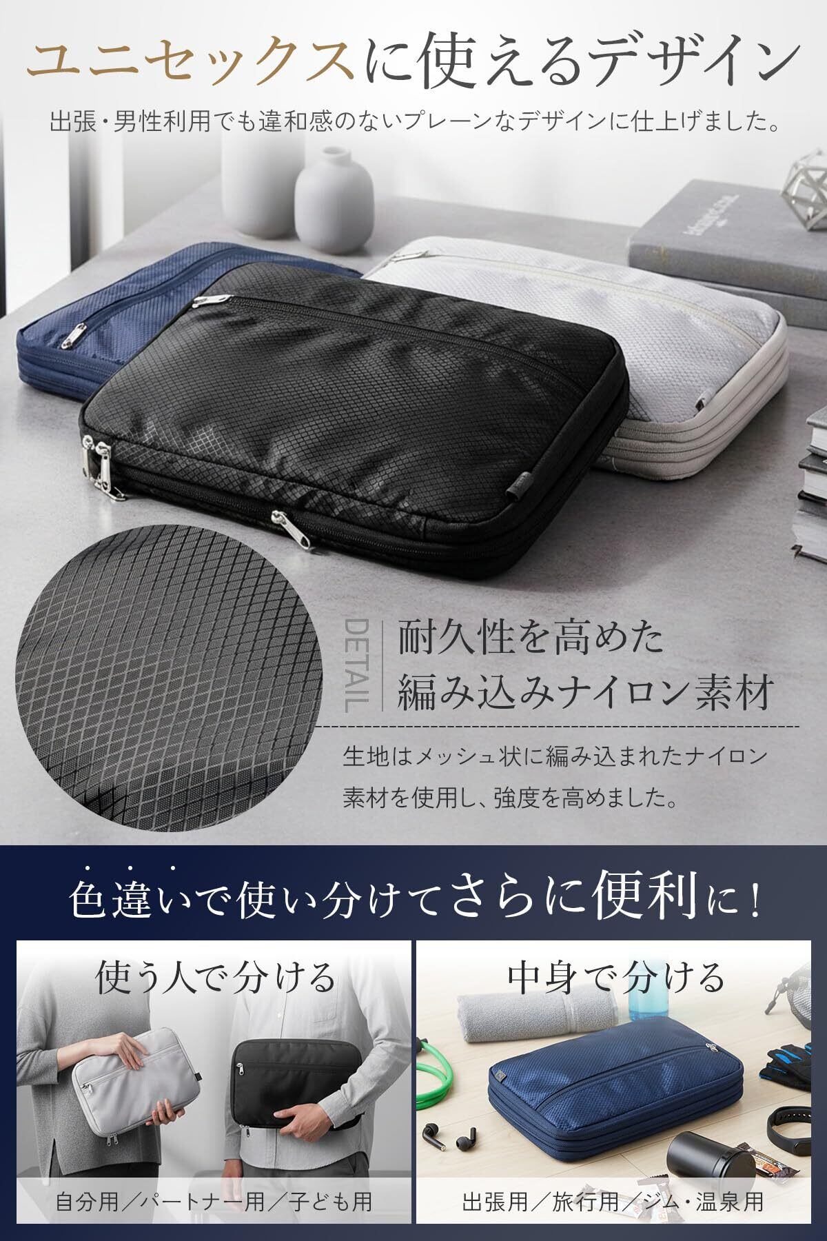 【性別・シーンを選ばないユニセックスカラー】 落ち着いたユニセックスカラーを採用し、メンズ・レディース問わず使いやすいデザインに。出張・旅行・日常収納まで幅広いシーンに自然になじみます。