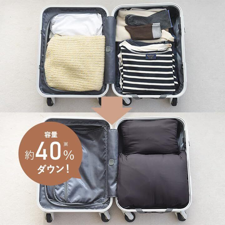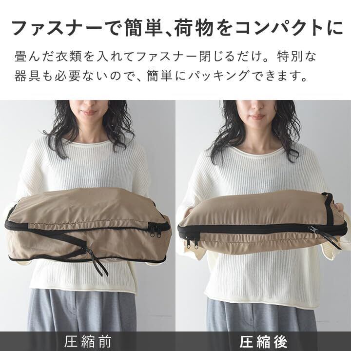 【ファスナーで簡単、荷物をコンパクトに】畳んだ衣類を入れてファスナー閉じるだけで圧縮完了。 特別な器具も必要ないので、旅先でも簡単にパッキングができます。収納ケースに服をいれたら、まず上部のファスナーを閉めます。次に中央ファスナーを閉めるだけで、簡単に衣類を圧縮できます。 簡単なのに厚みをしっかりダウン。空気を抜く手間もなく、旅行の荷造りもスムーズになります。