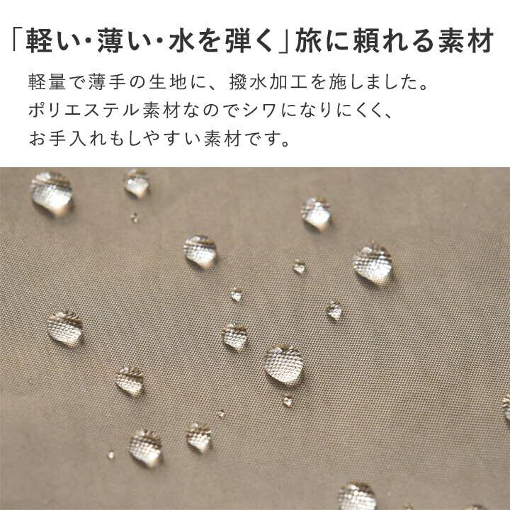 【軽い・薄い・水を弾く、旅に頼れる素材】Sサイズが75g、Lサイズが115gととっても軽量で薄手の生地に、撥水加工を施しました。ポリエステル素材なのでシワになりにくく、お手入れもしやすい素材です。 耐久性が高く、洗濯ネットに入れればお家で丸洗いもOK。 「使用済みの衣類を入れたから、ポーチも洗っておきたい。」そんな時にも気軽にお手入れができます。 ※撥水加工は、お洗濯や使用頻度やにより徐々に効果が弱まります。