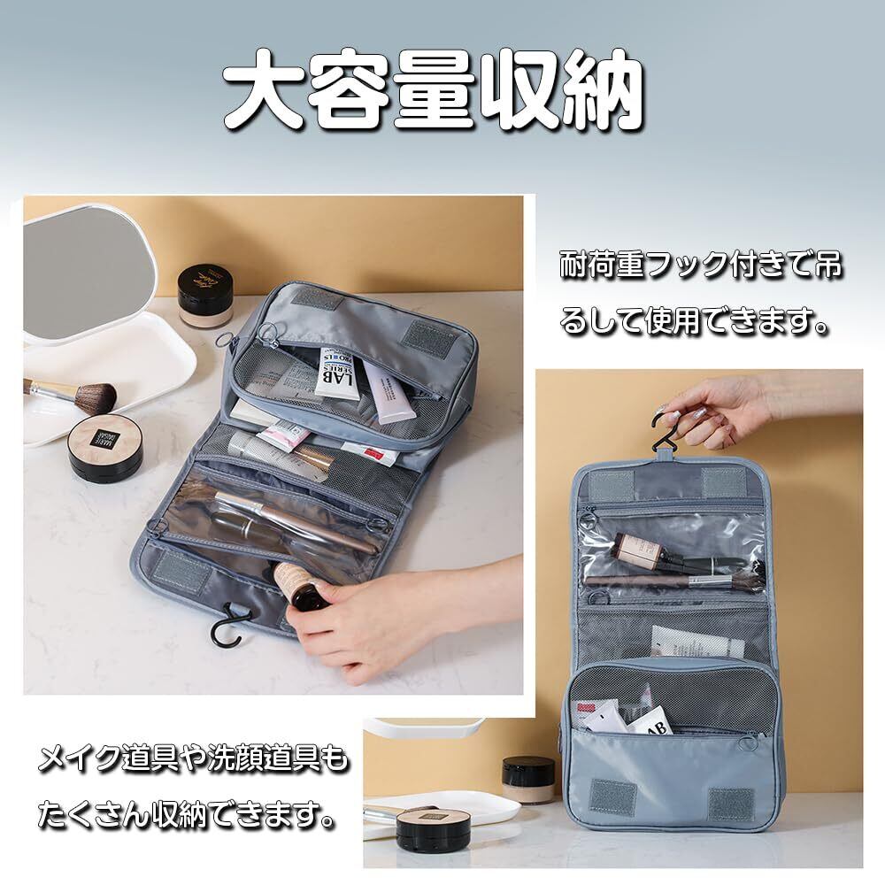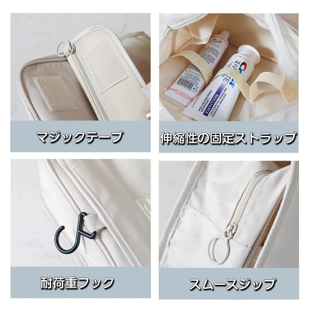 大容量の収納設計:複数のポケットがあり、化粧品や洗面用具をたくさん収納でき、前面の開口部のデザインは、シンプルな中から物を出すことができます。メインポケットはスペースが広く、ゴム紐の仕切りが付いており、化粧品ボトルを立てて収納でき、液体化粧品の漏れを防ぎます。背面にもポケットがあり、収納性に優れています。