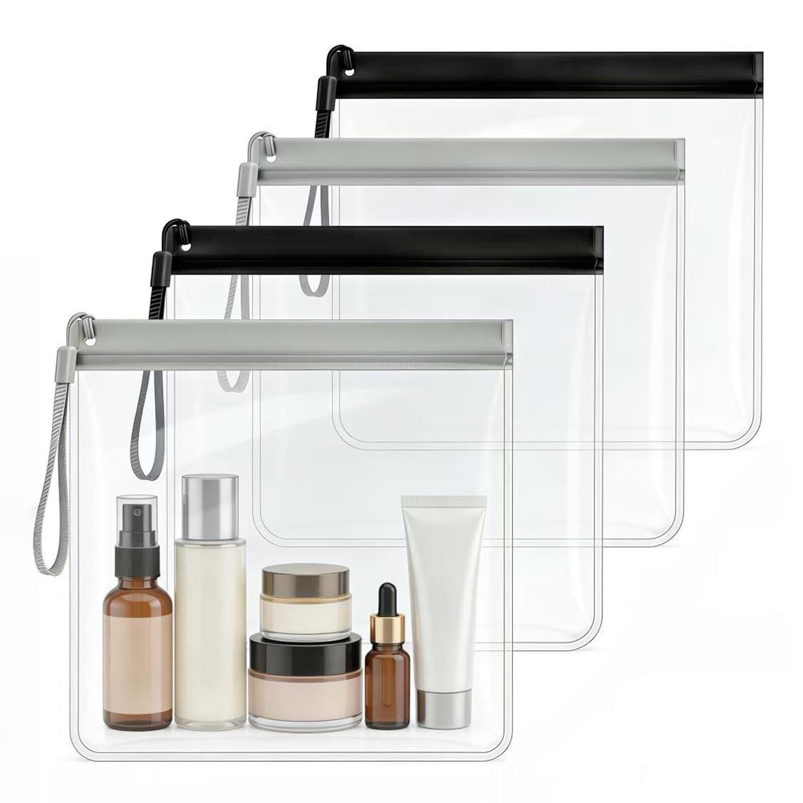 【セット内容】旅行用クリアポーチ4枚入り、サイズ20×20cm、厚み0.3mm、素材EVAプラスチック、カラーはブラックとグレー各2枚。軽量でコンパクトに持ち運び可能。 【防水・耐久性】丈夫なEVA素材を使用しており、水や汚れに強く、繰り返しの使用にも耐えます。柔らかく弾力性があるため破れにくく、環境にも配慮したリサイクル可能素材です。 【航空機対応】ジッパー付きで密封性が高く、液体の漏れを防止。各航空会社の機内持ち込み制限に対応しており、シャンプーや化粧品などの液体物を安心して収納できます。 【便利な収納設計】4枚セットで用途別に整理可能。ポーチごとに化粧品や小物を分けて収納でき、持ち手付きで直接手に持って運ぶことも可能です。旅行や出張の荷物整理に最適です。 【多用途】化粧品だけでなく、タオル、スマートフォン、アクセサリー、時計、ケーブル類なども収納可能。出張や旅行、ジム、プール、海水浴など幅広いシーンで活躍します。