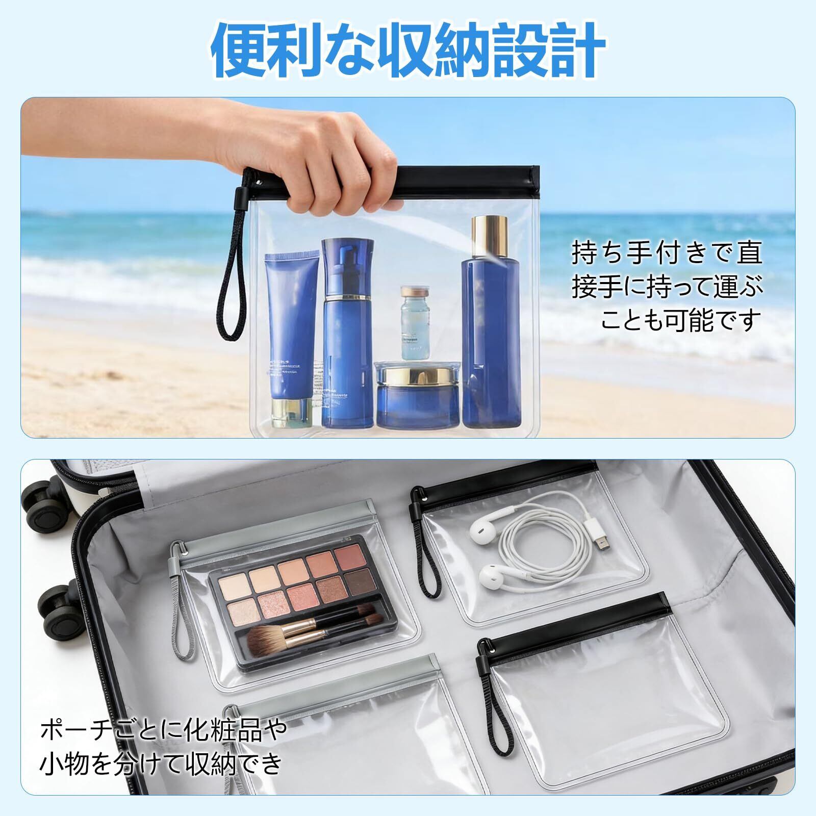 【多用途】化粧品だけでなく、タオル、スマートフォン、アクセサリー、時計、ケーブル類なども収納可能。出張や旅行、ジム、プール、海水浴など幅広いシーンで活躍します。