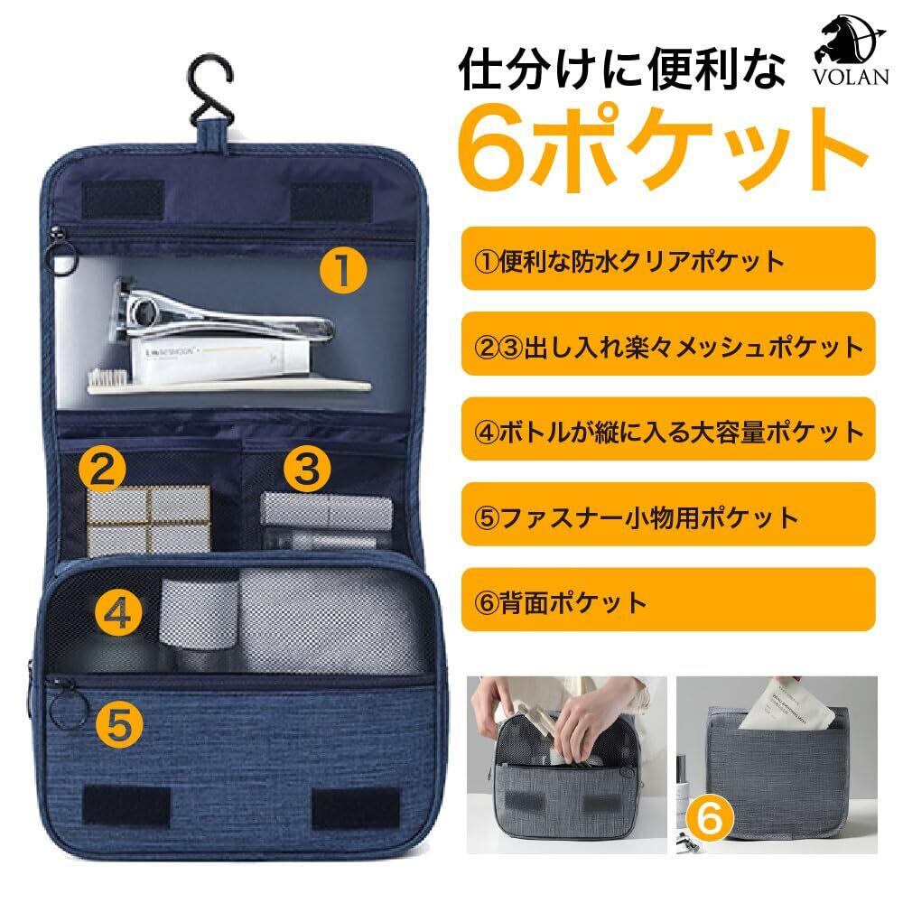 旅行 トラベル ポーチ 吊り下げ バッグ 大容量 収納 6ポケット 化粧 洗面 小物入れ (グレー)