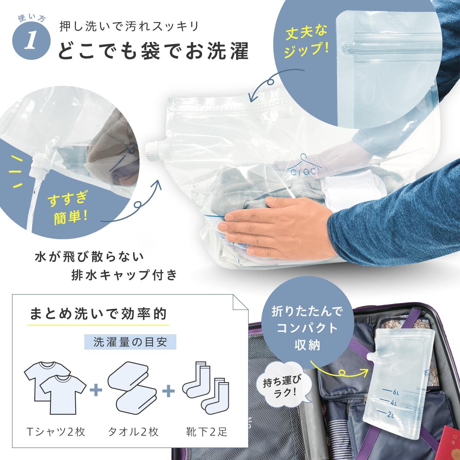 【数量限定】craci どこでも 洗濯袋 つけ置き 洗い 排水付き 大容量 45cm×35cm×マチ18cm 洗濯バック つけ置きバック ジッパーバック 持ち運びに便利 コンパクト収納 スライダー 旅行 出張 携帯 洗濯 上履き 靴 食器 防災 (3点セット)
