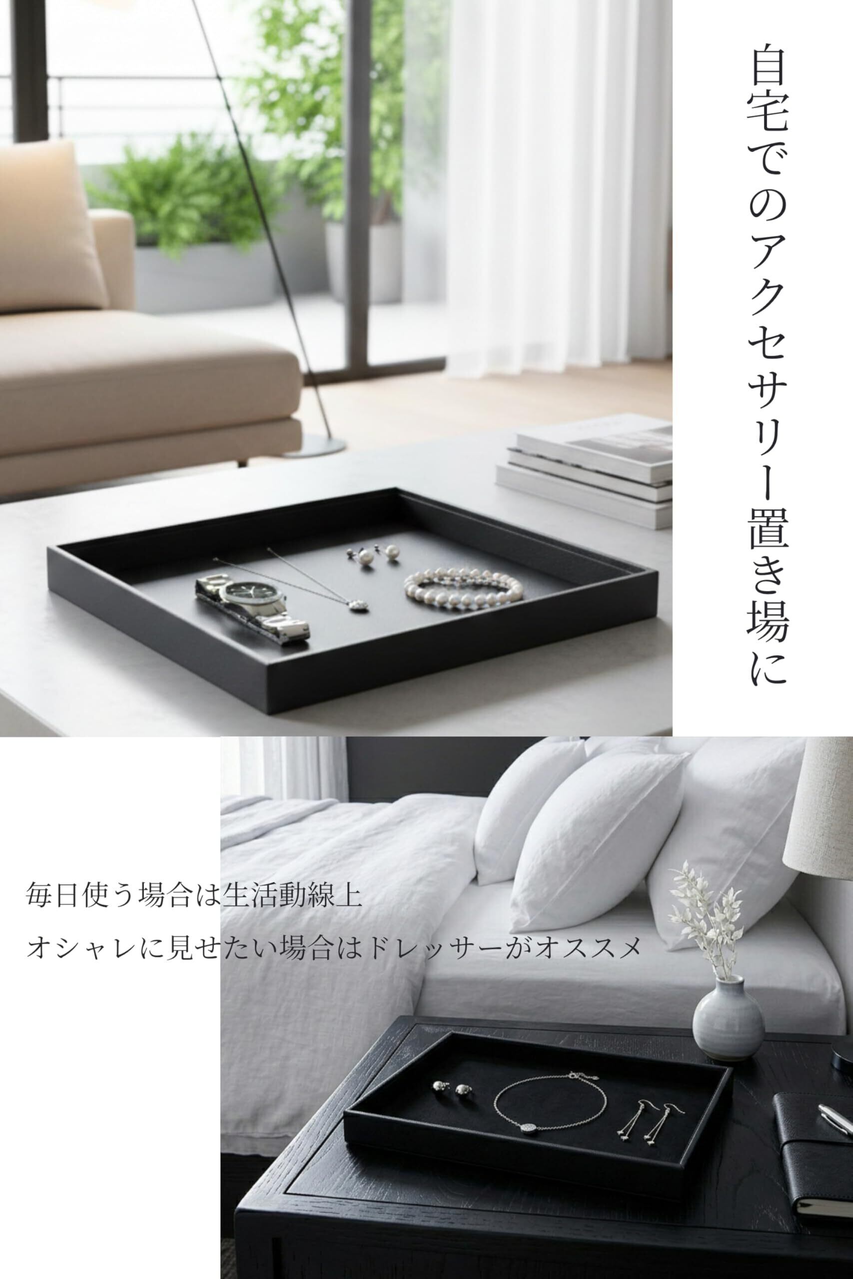 【接客業務をサポートする洗練デザイン】シンプルでスタイリッシュなジュエリートレイは、接客や商品展示の場面で高いプロフェッショナル感を演出します。業務用トレーとして、指輪や宝石を扱うショップに最適で、特別な瞬間をさらに引き立てます。