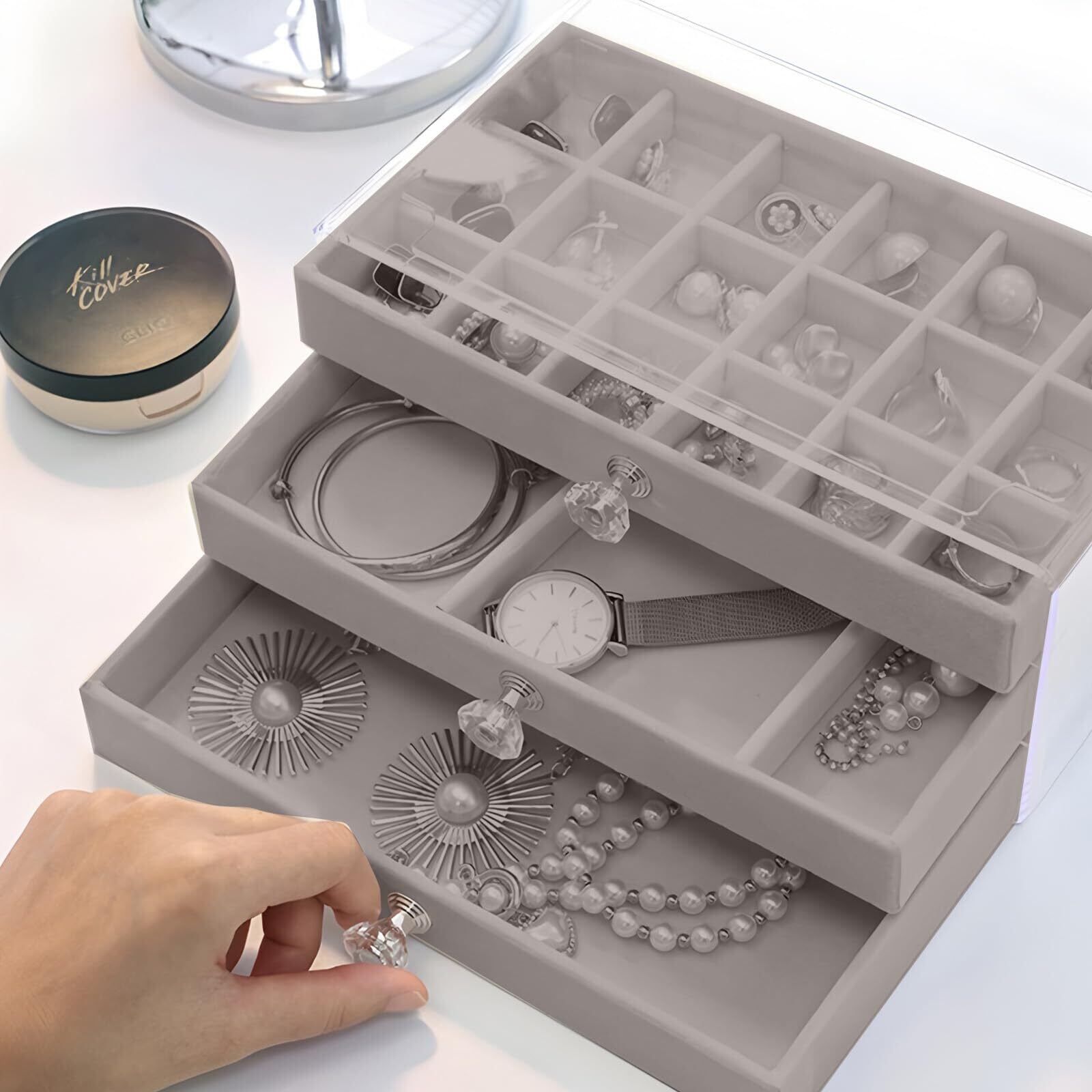 スムーズな3段引き出しで快適アクセス:3段アクセサリートレイの各段は、スムーズな開閉を実現しました。引き出し式のオーガナイザー設計により、重ねた状態でも最下段のピアス入れまで片手で簡単にアクセス可能です。密閉式の防塵ボックス構造で、貴重なルースケースやイヤリングケースの保管に最適。旅行用収納ボックスとしても、移動中のほこりや湿気からアクセサリーを守ります。