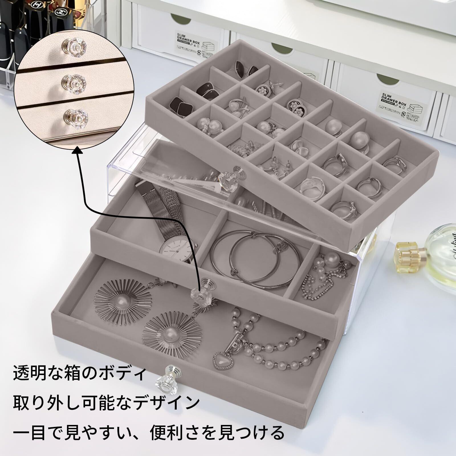 ジュエリーボックス アクセサリーケース 25区画仕切り 3段式引き出し収納 大容量 プレミアムアクセサリーオーガナイザー 防塵 防曇 収納 ディスプレイ収納ケース 持ち運び便利 展示用 小物整理 小物入れ ジュエリー 指輪 イヤリング ピアス ネックレス ディスプレイ 宝石 寝室/洗面所/ドレッサー対応 (グレー, 18+6+1)