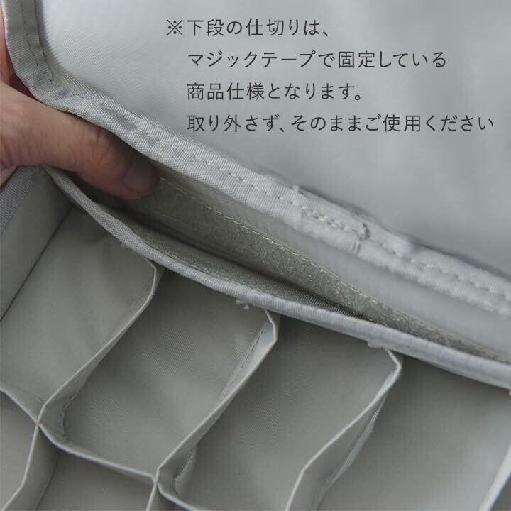 【SPEC】◆size:約縦17×横24×高さ9cm ◆仕様:【上段】上段テープ長さ/約23cm(中央にステッチ入り)、下段テープ長さ/約11cm ×2(スナップボタン留め)、仕切りポケット/約縦6×横4.5cm ×10【下段】ファスナー付きポケット/約縦16×横23cm ×1、仕切りスペース/約縦7.5横4.5cm ×10 ※マジックテープで着脱可