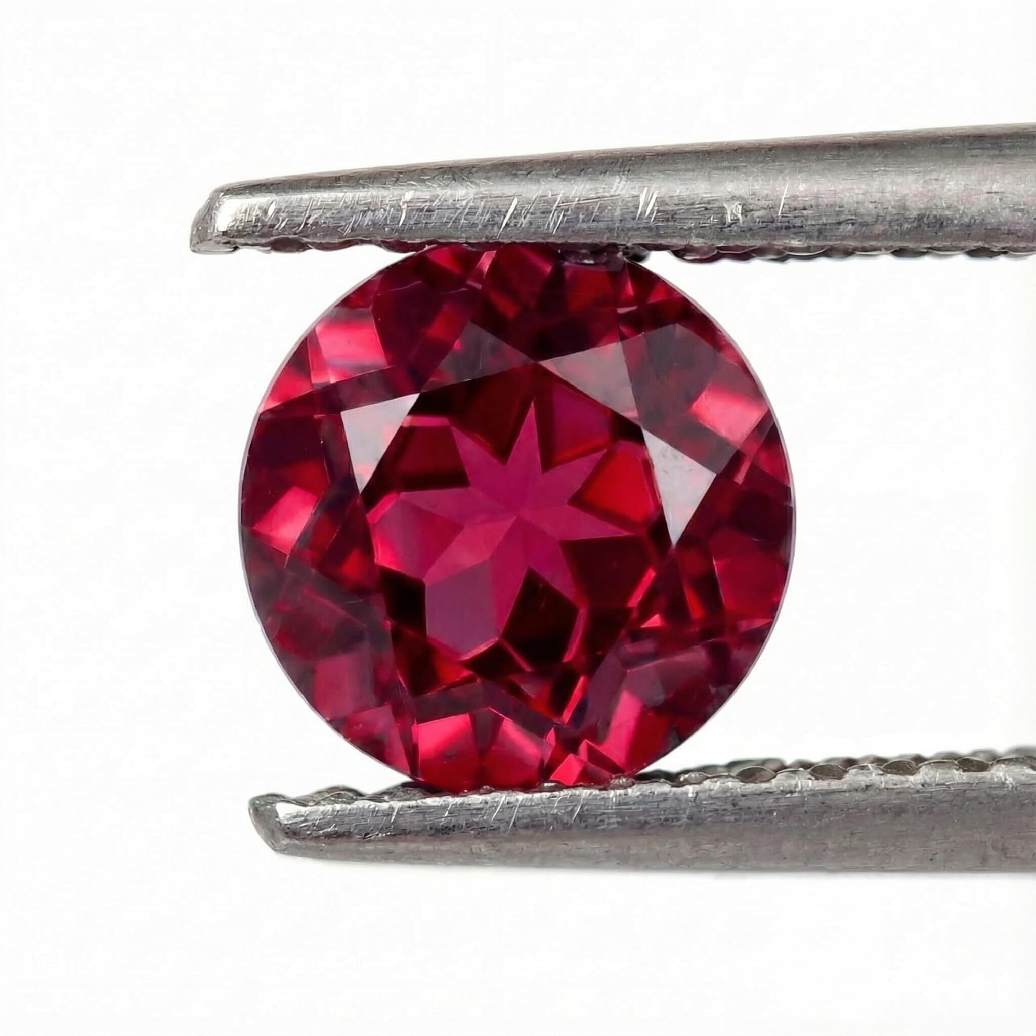 深紅/ルビーレッドの発色:人工ルビーのルースストーン(ラボ育成/ラボ)。深紅(しんく)/ルビーレッドの濃い赤色が魅力で、作品の主役ストーンとして存在感があります。